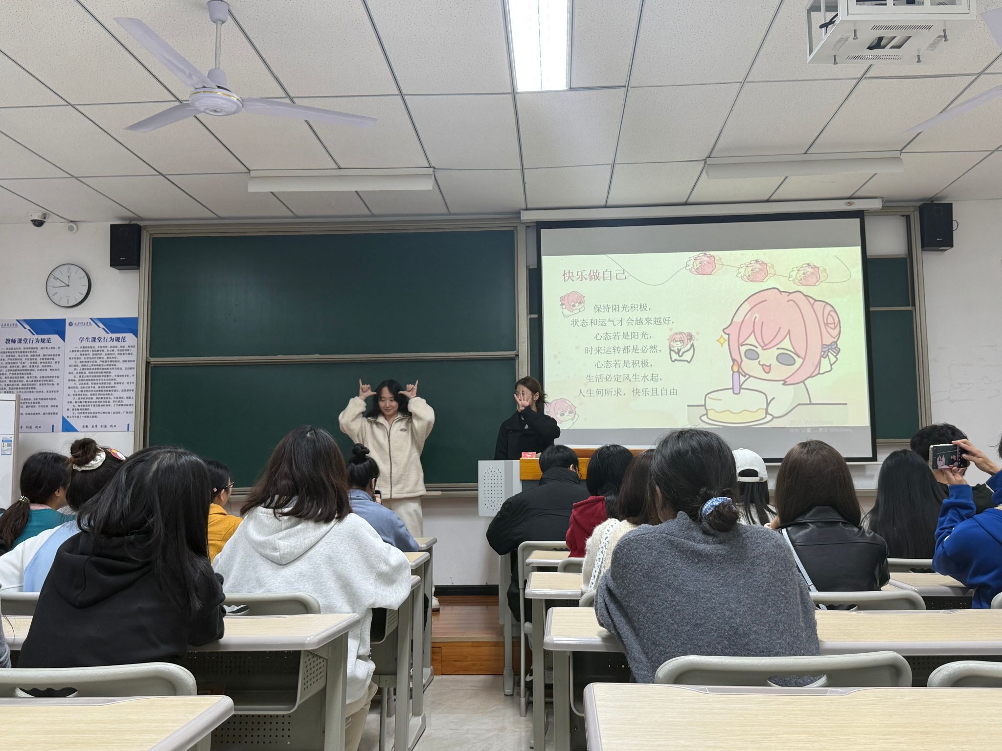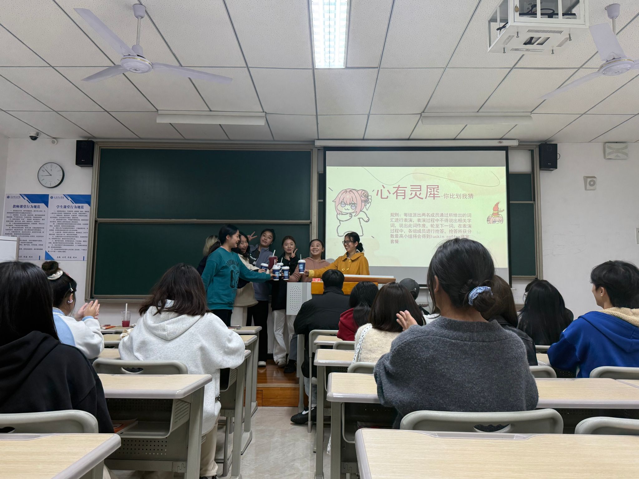 本次班会形式新颖,内容丰富,打破了传统说教模式。活动核心环节“你比划我来猜”设计了多个互动体验模块。在此环节中,同学们热情高涨,以小组的形式依次上台和全班同学进行互动并赢取奖励,让同学们跨过“社恐”门槛,拒绝做“低头族”。辅导员翁焰也参与其中。整个过程打破了传统师生关系,大家都以朋友关系坦诚相待,真正达到了课堂效果!