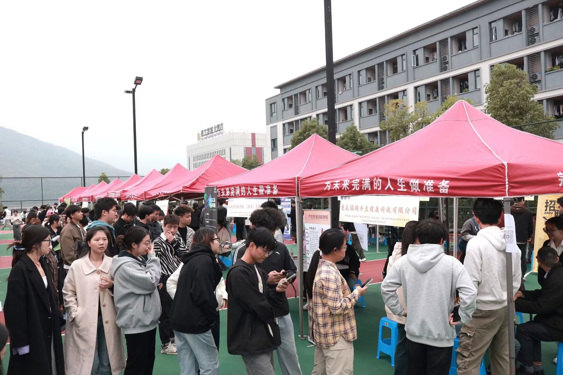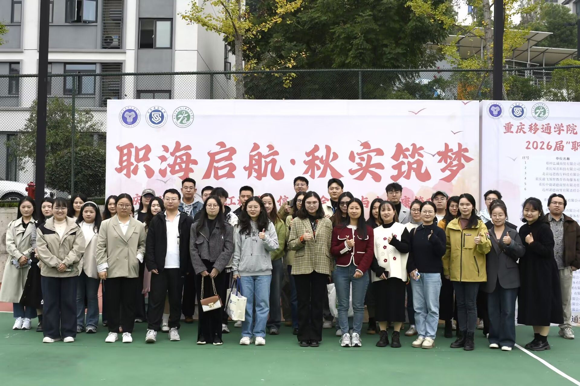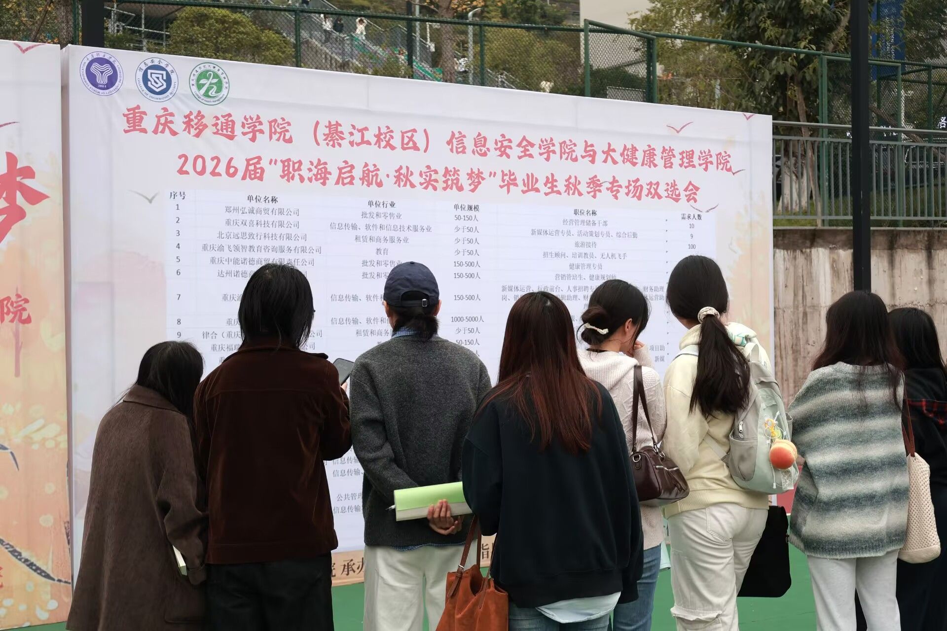 为搭建毕业生与用人单位高效对接平台,11月6日,由重庆移通学院信息安全学院与大健康管理学院联合主办的“职海启航·秋实筑梦”2026届毕业生秋季专场双选会,在瀛溪书院1号楼篮球场成功举行。