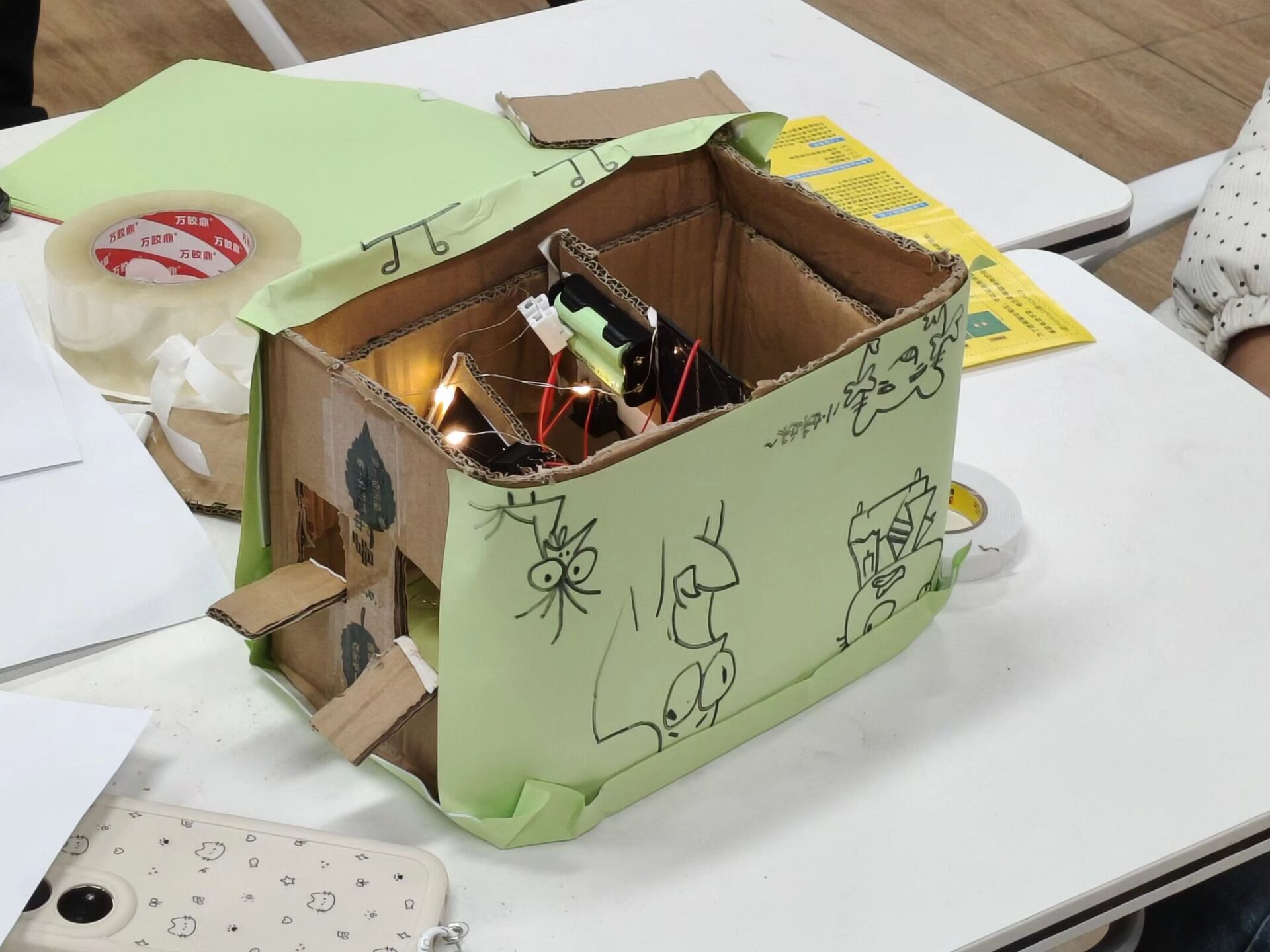 在掌握了“光—电”转换原理后,工作人员指导同学们立即动手,在快递盒内嵌入太阳能板、接好微型电路,最后用提笔彩绘、贴纸、镂空的方式,将一只只“素颜”快递盒变成了独具特色的智能个性小夜灯。