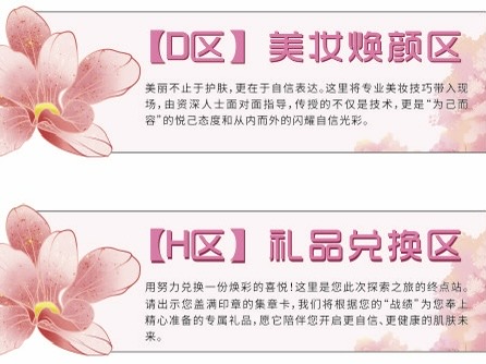 【D区】美妆焕颜区:美丽不止于护肤,更在于自信表达。我们将会把专业美妆技巧带入现场,由资深人士面对面指导,不仅传授技术,更培养“为己而容”的悦己态度和从内而外的闪耀自信。