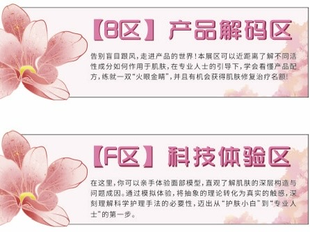 【B区】产品解码区:告别盲目跟风,走进产品世界!让你在专业人士的指导下,学会看懂产品配方,练就一双“火眼金睛”,并且有机会获得肌肤修复治疗名额!