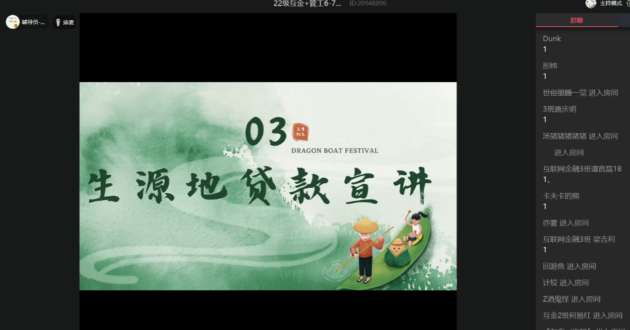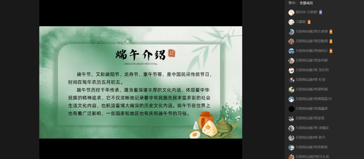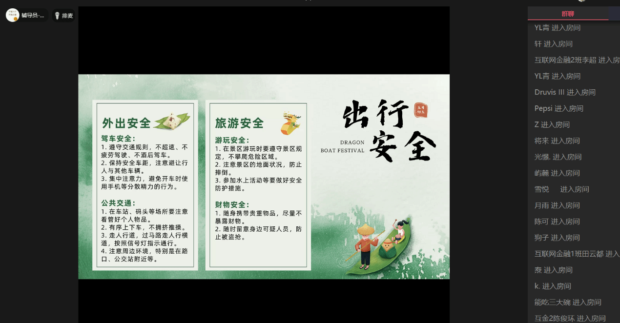 随着端午节的临近,为进一步加强学生的安全教育,提高同学们的自我防护意识,数字经济与信息管理学院2022级互联网金融1-4班于6月4日22:00在QQ群课堂举办了端午节安全教育年级会,会议由辅导员任超群主持,2022级互联网金融全体同学参加。本次年级会旨在确保同学们度过一个安全、快乐的端午佳节。