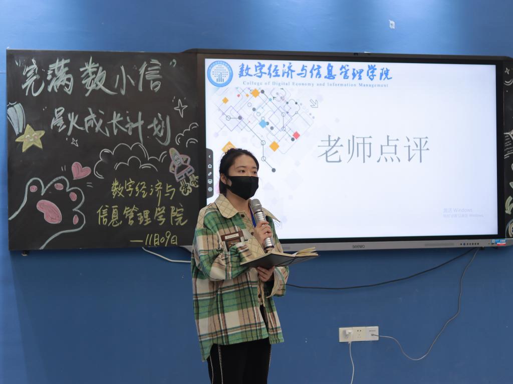 本次决赛最后,数字经济与信息管理学院社团活动板块指导老师任超群老师和淬炼·国际商学院组织建设板块指导老师肖琳老师对同学们的答辩进行点评,她们指出了决赛答辩中的优点和不足,表达了感想与看法,内容实在,层次清楚,语言生动地将班级海报元素设计细致展现出来,让大家真切感受到积极向上地班级氛围,最后鼓励同学们总结经验在今后的活动表现中能更上一层楼。