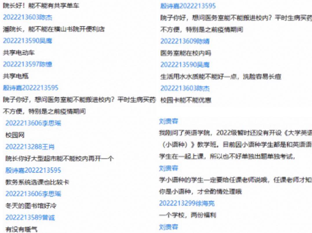 院长潘显兵对于问题回答是:热水会向有关部门反映;医务室、便利店、共享单车学校都正在规划当中,会一步步落实;网络问题,会给网络中心提意见;洗衣机增设,图书馆座位增设学校会根据实际情况,统筹考虑,会有数量的控制和考量,我们会给学校反映同学们提出的意见,图书馆位置不够目前可以解决方法就是把学院的功能室,还有学校教室等利用起来。