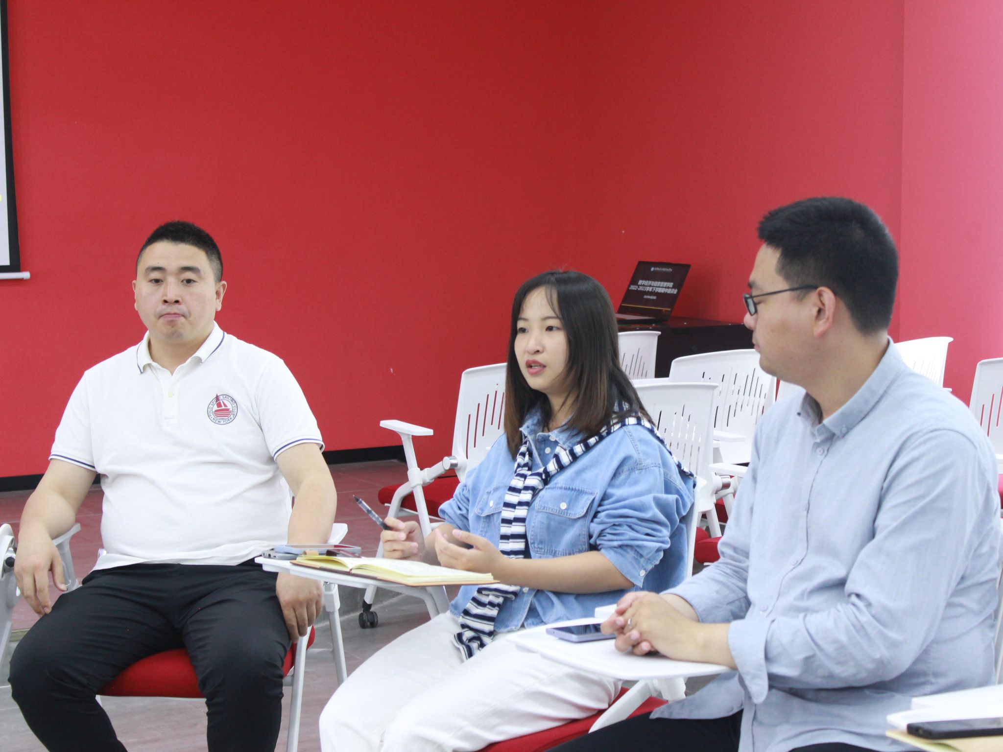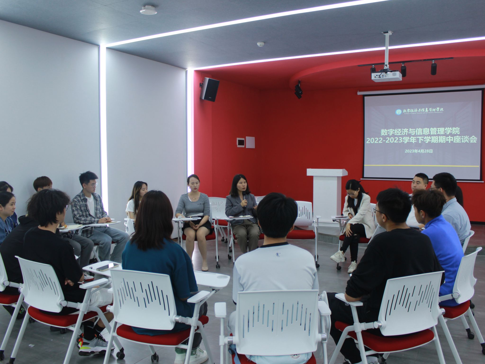 入春解作千般语,拂曙能先百鸟啼。经历半学期的学习生活,不少问题需要解答,对此数字经济与信息管理学院特于4月28日上午10:30在玉棠书院Talk King演讲中心开展了2022-2023学年下学期期中座谈会。此次会议邀请数字经济与信息管理学院学工副院长任瑞娟老师、学生工作办公室主任尹金维老师、教师代表乔兴刚老师和陈明燕老师、2022级辅导员王颖老师、王健老师、任超群老师以及学生骨干成员参加。