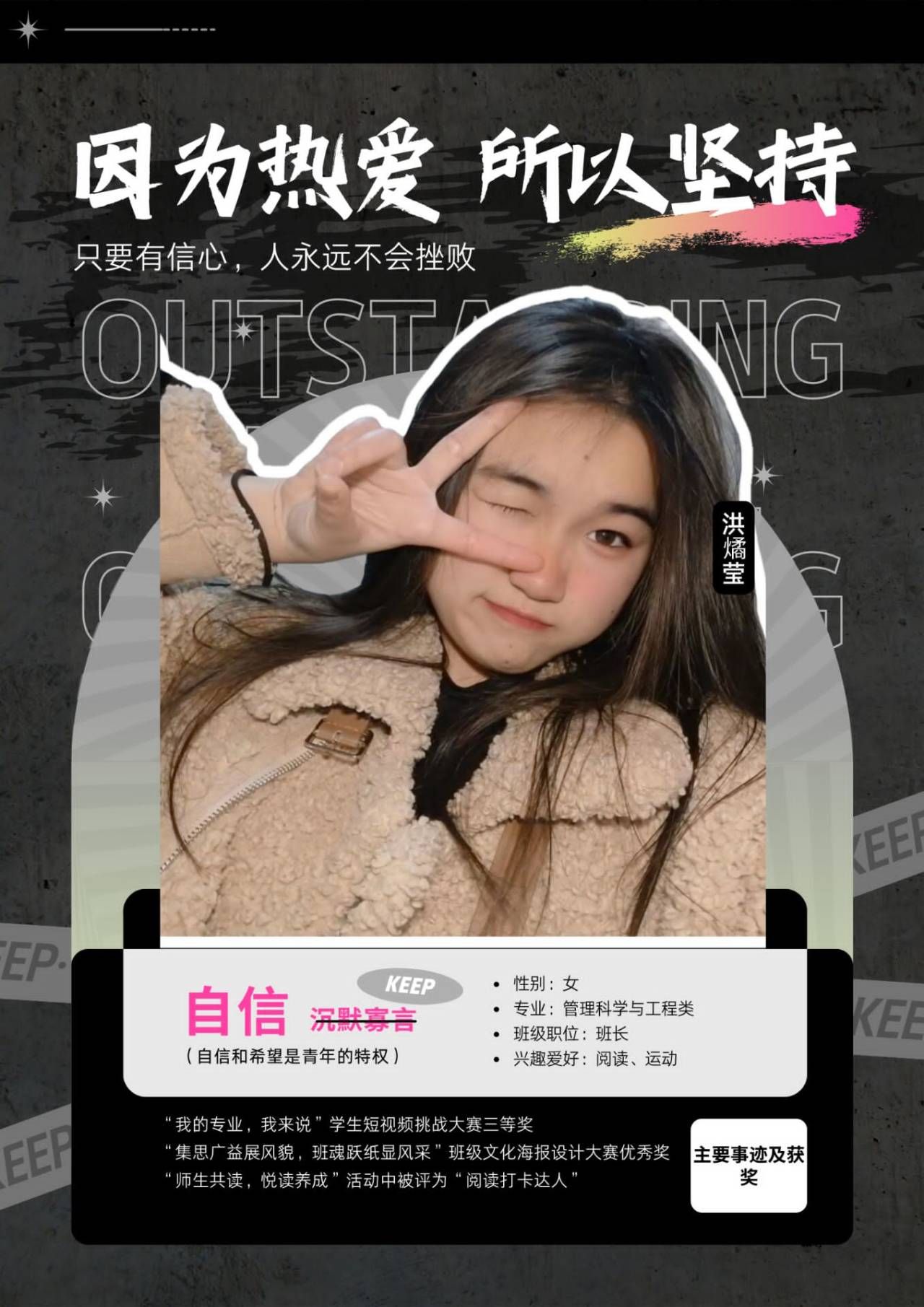 洪燏莹同学在采用海报设计的形式,简洁明了的介绍自己优秀先进事迹和个性宣言;涂凯同学运用vcr视频拍摄方式记录自己获得十余项奖项荣誉和自学PS、PR、AE等技能,树立奋发向上、勤奋好学的榜样形象;田雅晴同学将大学分为生活篇、学习篇、思想篇三方面进行介绍,展现她积极向上的生活态度和“勤于学善于思敏于行”的学习态度。班级榜样宣传由心理委员带头牵动,其他班委发挥辅助作用,全班积极思考、认真制作,设计出来的海报简洁意骇、各具班级特色。