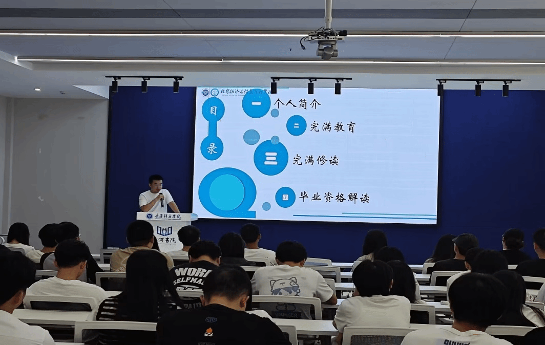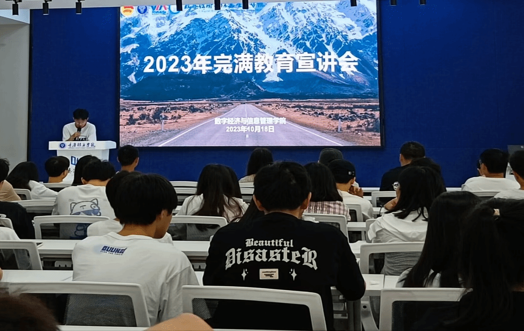 2023年10月18日下午13:00,数字经济与信息管理学院在綦河书院观涛多功能报告厅举办了“完满教育”主题宣讲。本次参会的有大数据管理与应用专升本1-5班、信息管理与系统管理专升本1班、数字经济7班、供应链管理1-3班、互联网金融1-3班。此外,学院还特别邀请了计算机学院2021级计算机科学与技术专业的郑浩然学长、2022级青年志愿者联合会推广交流中心部长张宇航学长对完满教育进行宣讲,让2023级新生充分了解并诠释完满教育的意义及内涵。