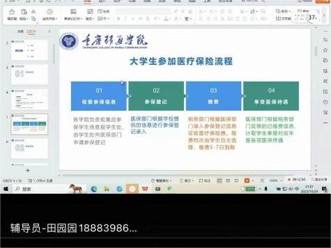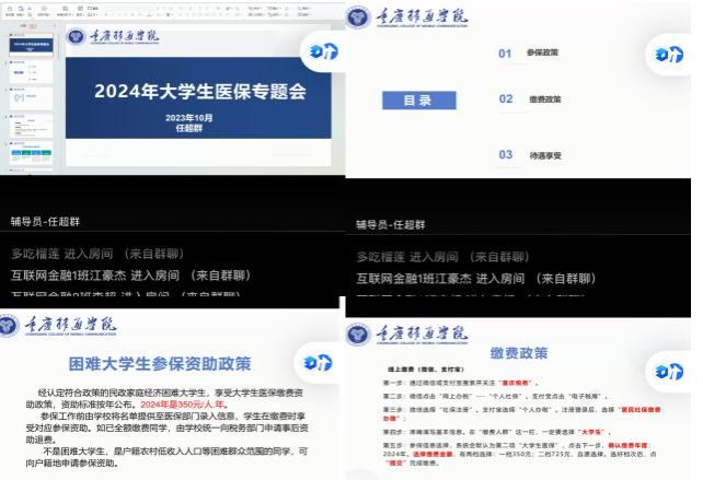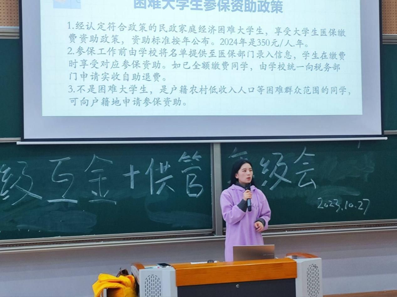 在宣讲会开展过程中,各班辅导员首先为同学们阐述了医疗保险的重要性,推行大学生参加城乡居民合作医疗保险制度是一项涉及大学生切身利益的重要保障制度。宣讲会上,各班级辅导员从“参保时间”“参保方式”“缴费流程”“享受待遇”“就医管理”等方面进行解读。重点强调了大学生医保应保尽保、不漏保、不错保,尤其是经认定符合政策的民政家庭经济困难大学生,资助标准按年公布若购买一档医保则可享受350元/人的优惠政策;家庭经济困难但未评上国家助学金的学生可咨询所在地民政部门参保,享受本地优惠政策。并指出自2023年起,在渝高校大学生(含全日制研究生)参加居民医保的参保缴费期从学年调整为自然年度,待遇享受时间为次年1月1日至12月31日。