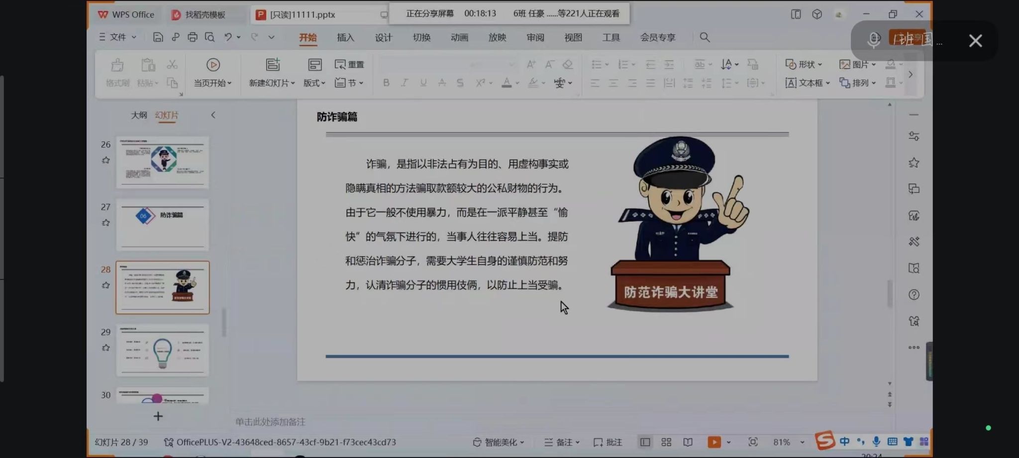 随着网络技术的发展和社会治安形势的变化,各类诈骗手段层出不穷,给大学生的个人成长造成了严重的损害。为了提升同学们的防诈意识,保障学生的安全,本次安全教育也对诈骗相关知识进行了讲解,旨在同学们能够警惕各种诈骗陷阱,提高识别和应对风险的能力,增强自我保护意识。