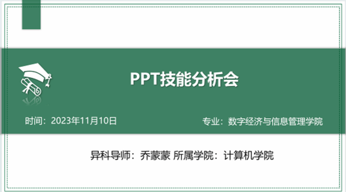 为提升学生的计算器操作水平、综合素质和学习兴趣,帮助他们更好地适应数字化时代的学习要求。异科导师乔蒙蒙带领小组成员于2023年11月10日晚上19:00-20:30在实训楼206进行“掌握PPT艺术,引领数字化时代潮流”为主题的PPT技能分享会。