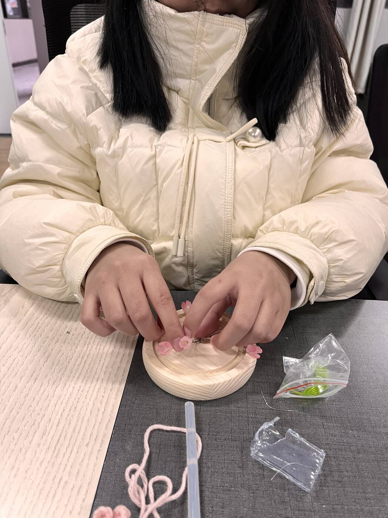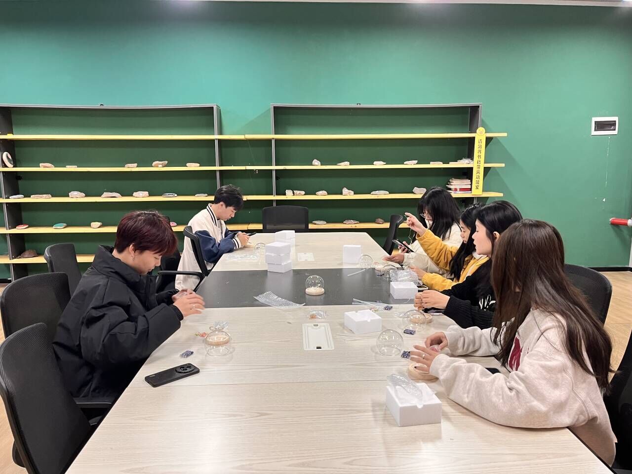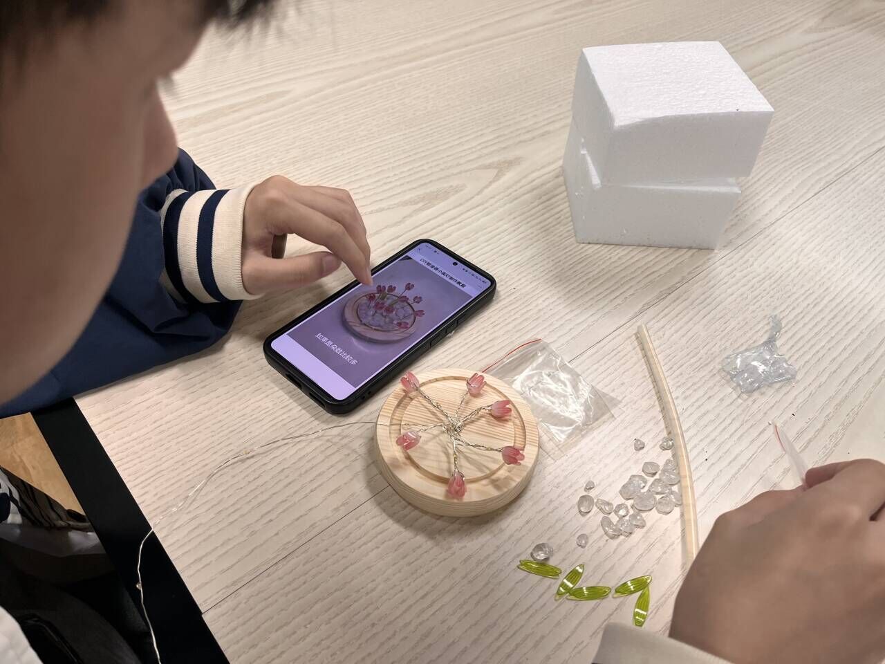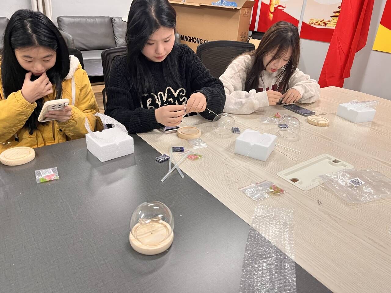 活动开始前,老师先为学生清点了制作小夜灯的素材,并讲解了素材制作的方法。同学们凭着对手工的热爱学得十分认真,昔日积累的手工经验在此时都派上了用场。同学们按照步骤先装上电池,确保灯源正常通电;然后解开灯串,穿过底座;再将郁金香小灯一个个串起来;用水凝胶固定在灯罩上;再根据自己的理解和想象将小夜灯里的透明玻璃石头摆放在底座的任意位置;最后盖上玻璃罩子,打开电源,小夜灯就制作完成了。