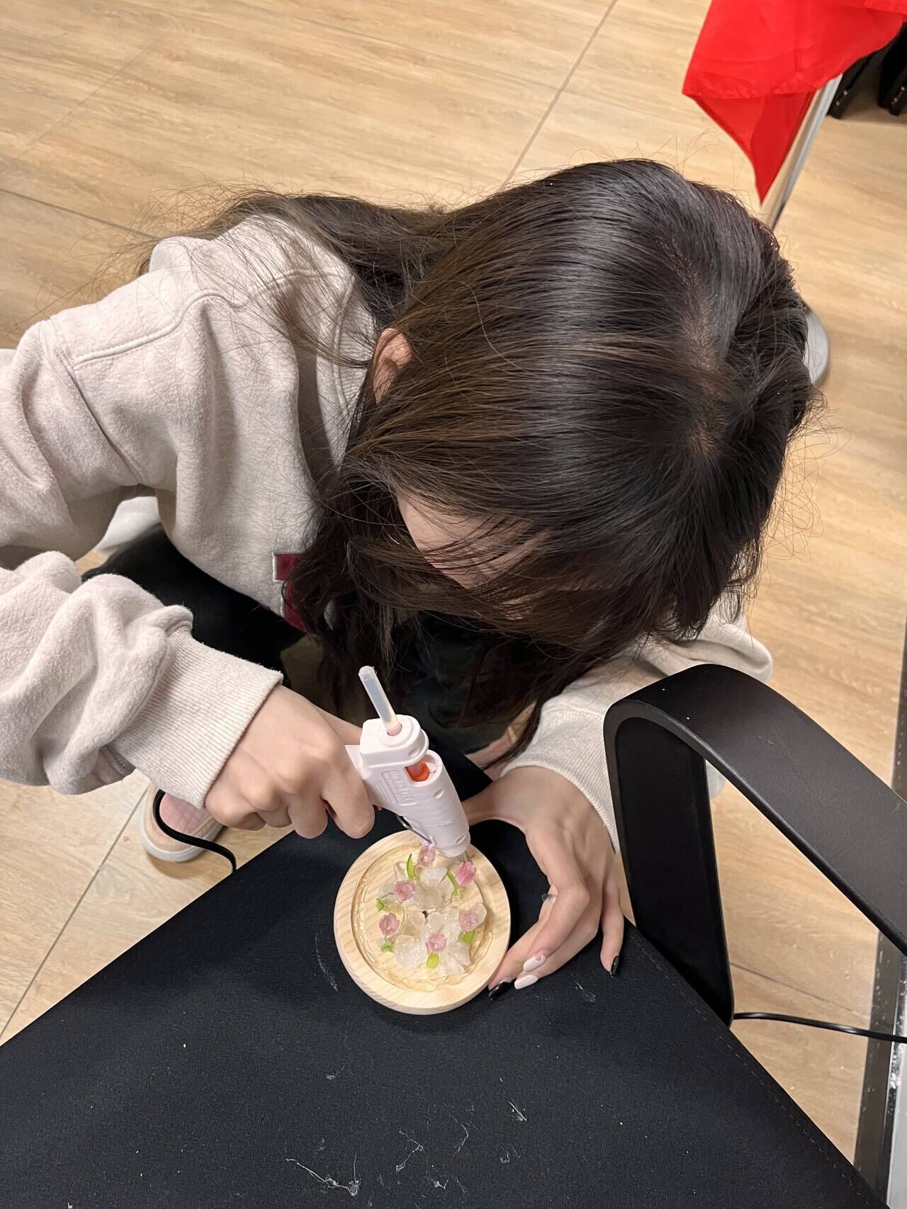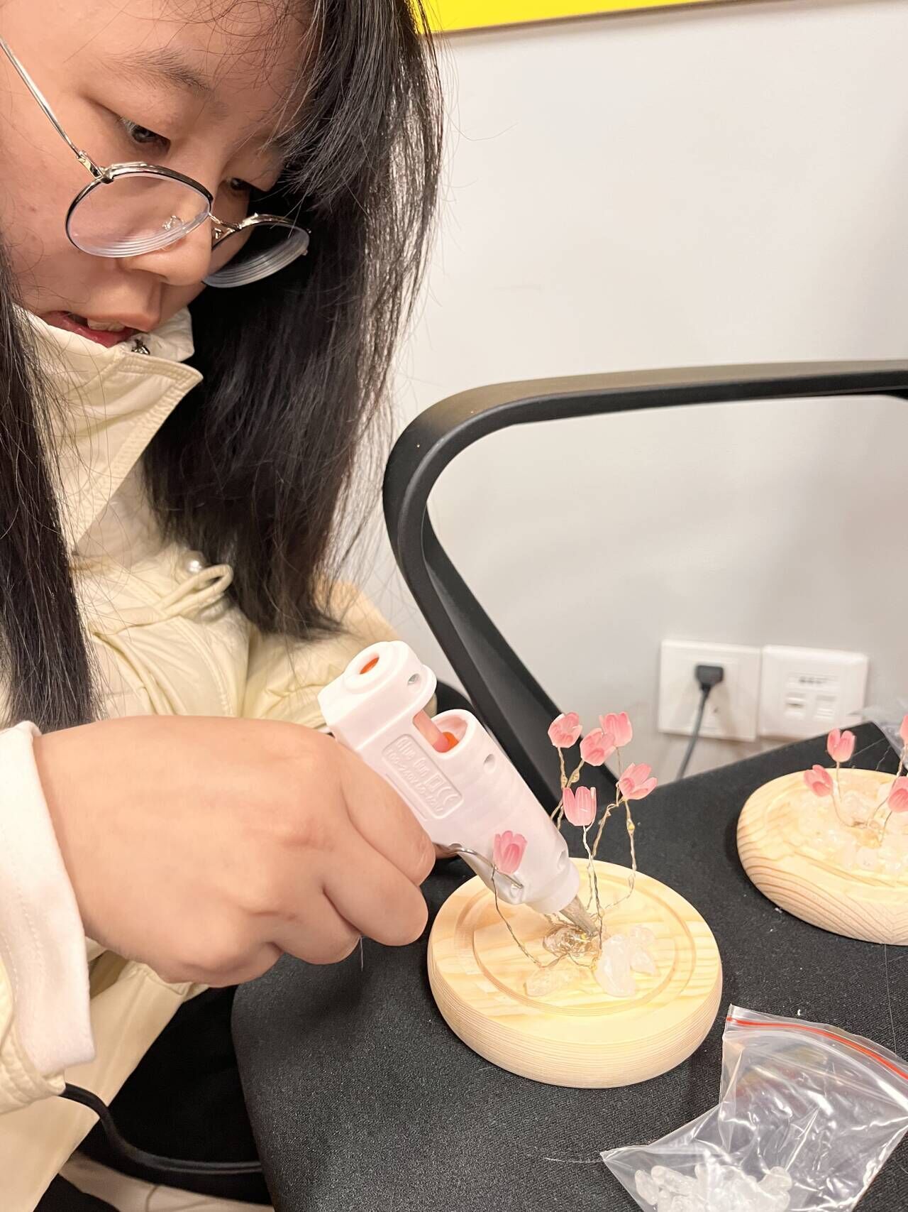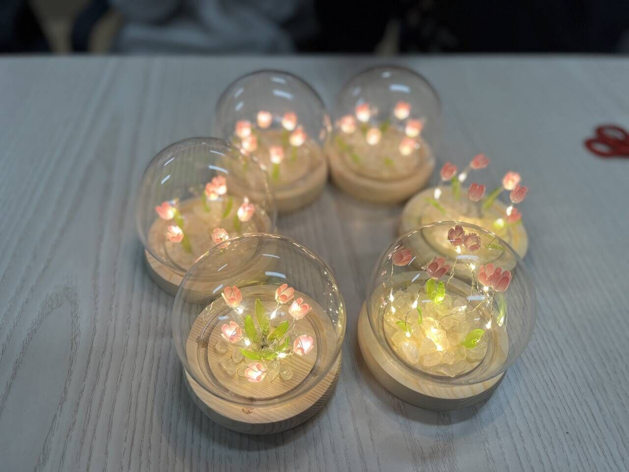 制作过程中,同学们认真调整小夜灯内的每枝郁金香,将自己的创意与审美情趣倾注其中,让郁金香绽放,争奇斗艳。经过一个多小时的努力,大家的小夜灯都已制作完成。