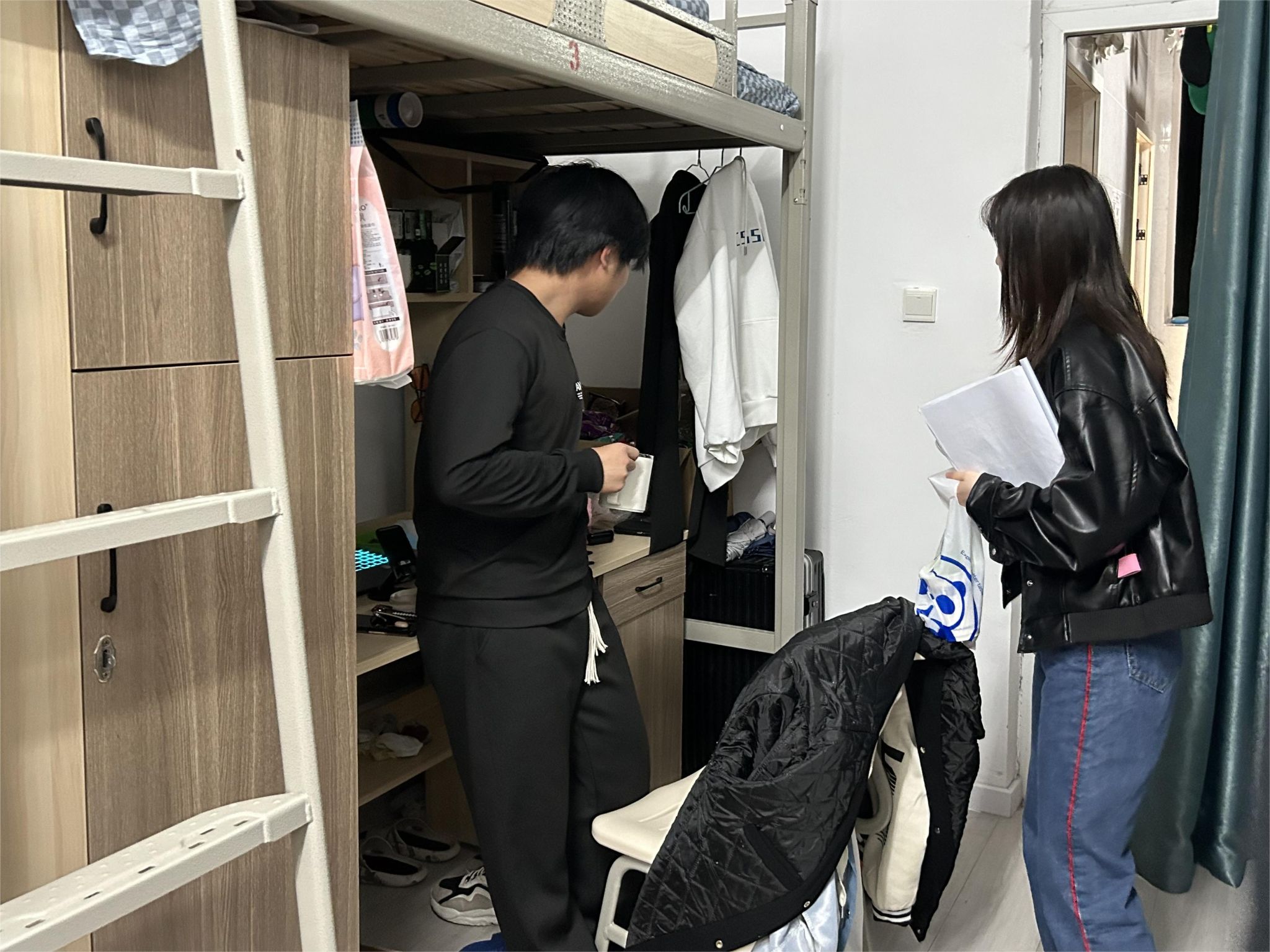 面对联合查寝,同学们略显拘束,但仍旧热情欢迎各位老师的到来。寝室整洁明亮,书本摆放整齐,散发着青春特有的蓬勃朝气。此次宿舍走访工作,辅导员们全面了解了学生宿舍卫生情况,排查了宿舍安全隐患问题,树立了学生们的安全风险防范意识,为营造干净的宿舍环境起到了积极的作用。希望同学持续提高文明意识,努力营造整洁、温馨、谐的宿舍文化氛围。同时也有利于辅导员深入了解学生的思想、学习和生活状况,为学院各项工作的顺利开展奠定坚实基础。