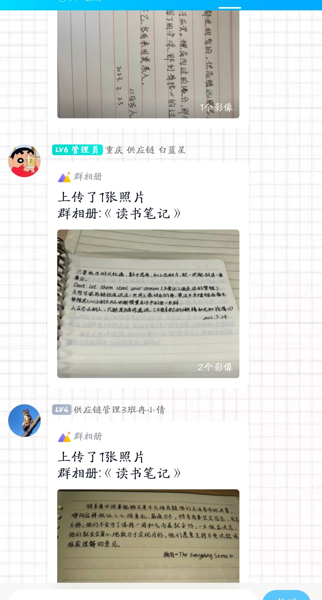 阅读是获取知识、增长智慧的重要方式,是传承文明、提高国民素质的重要途径。为了进一步丰富班团活动、拓宽知识面,丰富同学们的课余生活;也为了进一步激发同学们的读书热情,提高同学的文化修养和综合素质,数字经济与信息管理学院2022级供应链管理03班结合学校课题和本班的实际情况,制定了营造书香班级的计划,在班团开展了完超阅读打卡计划。