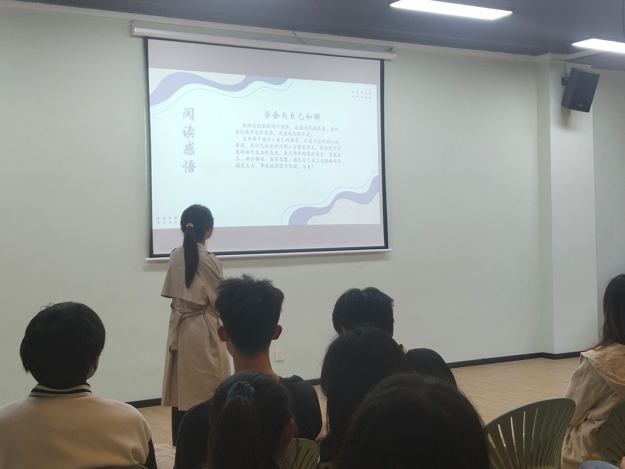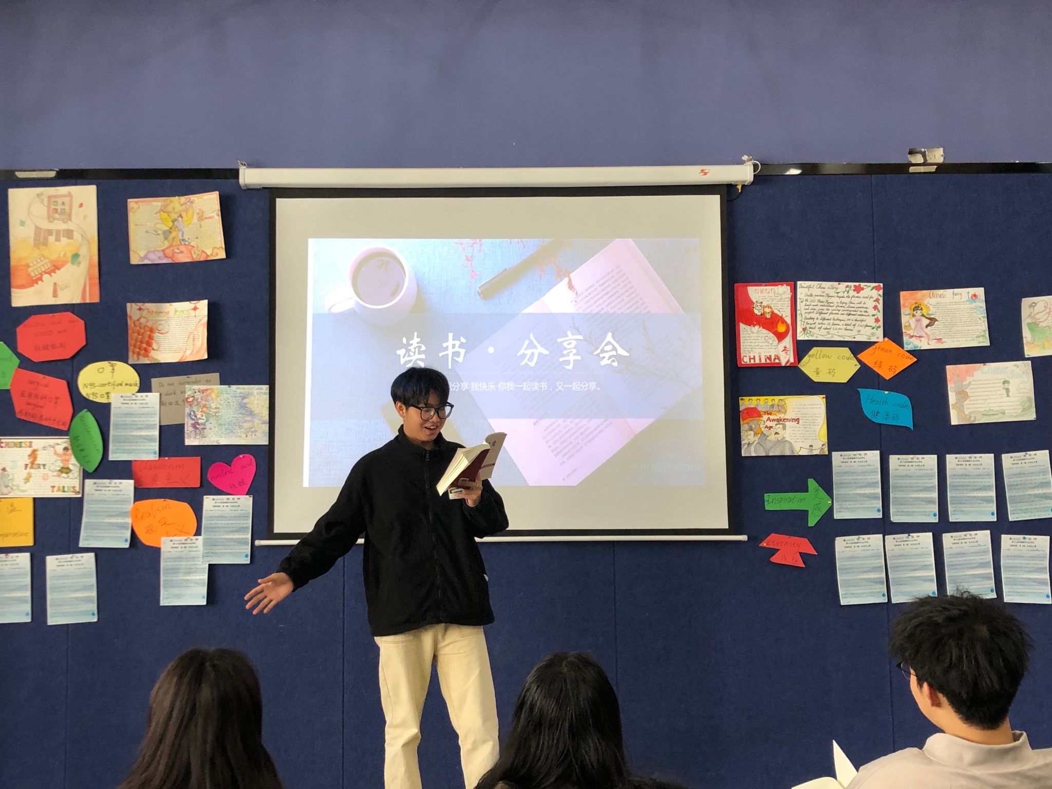 在阅读分享活动中,有位同学分享了《活着》,书中描述了再急剧变革的时代中许福贵的不幸遭遇和坎坷命运,展现了当时命运的无奈与人的坚韧,同学的真挚发言引起了班级同学的共鸣,感怀那个时代普通底层阶级的不容易。在阅读分享中碰撞出智慧的火花,引导着同学们共同发展和共同构建身边更多理想的阅读空间,让阅读不设限,无处不在。为了鼓励同学们勇于上台,展现自我,在活动中进行评分考核并给予一定奖励,考核的不仅是ppt的制作更是同学们综合答辩能力。