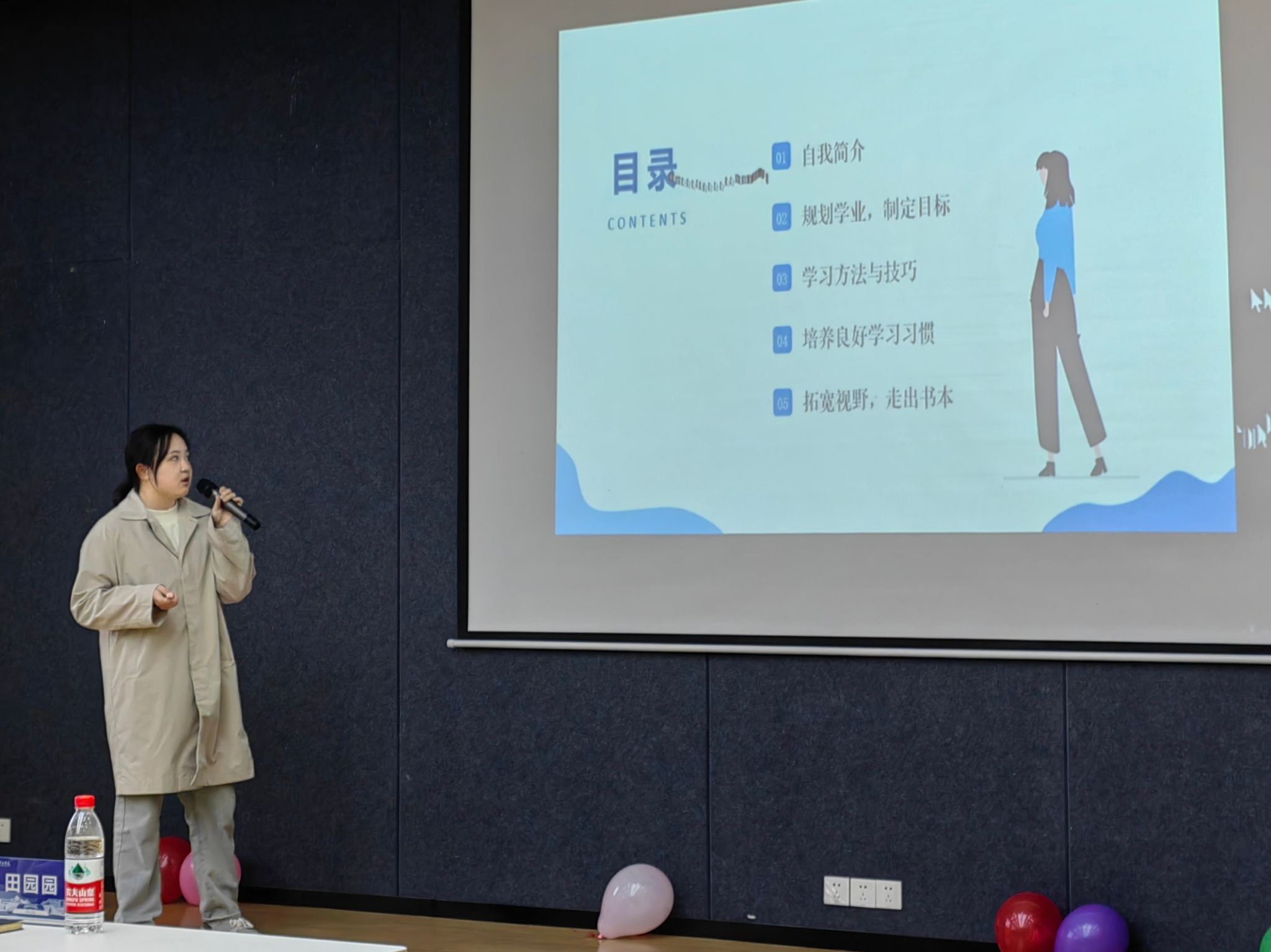 随后,2022级数字经济专业樊佳欣同学向同学们分享了在大学如何找到自己的学习方式。她强调到无论是哪个专业,成功的关键都在于持续的努力和积极的态度,建议大家要制定合理的学习计划,充分利用课余时间进行自主学习,形成良好的学习习惯。