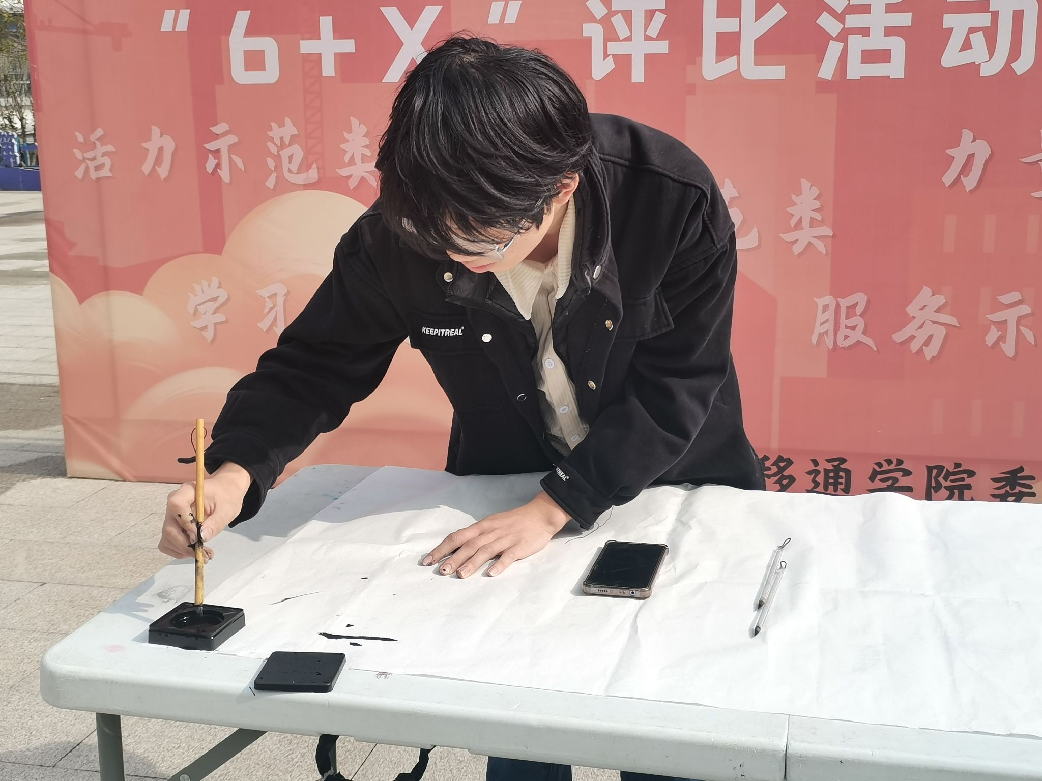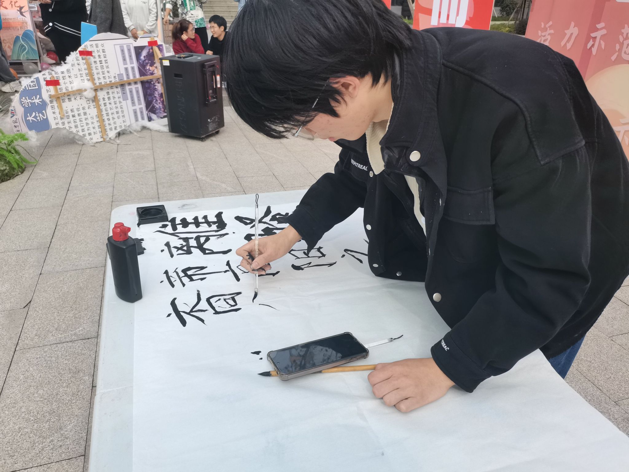 书法是中华民族的“民魂国宝”,它能够冶心练气。现场的书法作品和才艺的展示,吸引了大量的同学前来驻足观看。同学们通过审视和思考,去体味作品的内涵,接受作品的感染,感受作品的艺术魅力,看到了书法文化的美。言为心声,书为心画,书法里有中华民族的文化自信。与此同时,彭杰同学还进行了现场书法表演,用它沉稳的手法在纸上书写着广为流传的千古名篇《离骚》,提笔、落笔,都充满着书法的韵味,这一刻尽显书法风采、书法魅力,再配上背景音乐《洞庭新歌》,其古风的旋律令人仿佛处于高山流水之境。