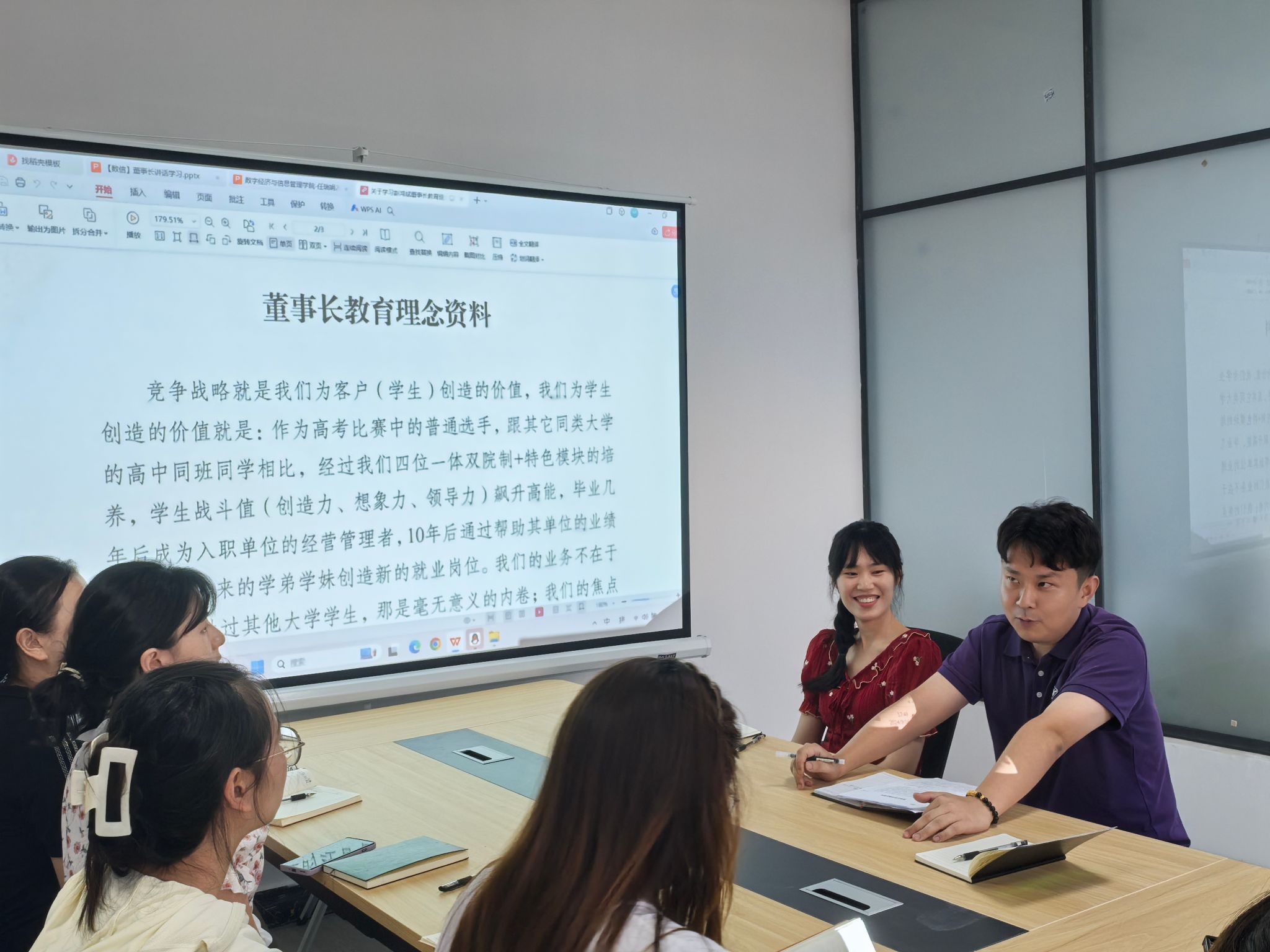 会议伊始,学工副院长任瑞娟传达了关于学习彭鸿斌董事长教育理念讲话的通知精神,增强了各位辅导员的重视意识;随后,任院长深入细致的讲解了《董事长教育理念资料》的讲话背景,并对讲话内容进行了详细的梳理;最后,任院长强调,要结合彭鸿斌董事长的讲话,将完满教育融入到学校教育中的重要性,在日常工作中,要以彭鸿斌董事长的教育理念为引领,立足“四位一体双院制+特色课程”的育人理念,勇担培养数字经济时代的高情商经营管理人才的重任。