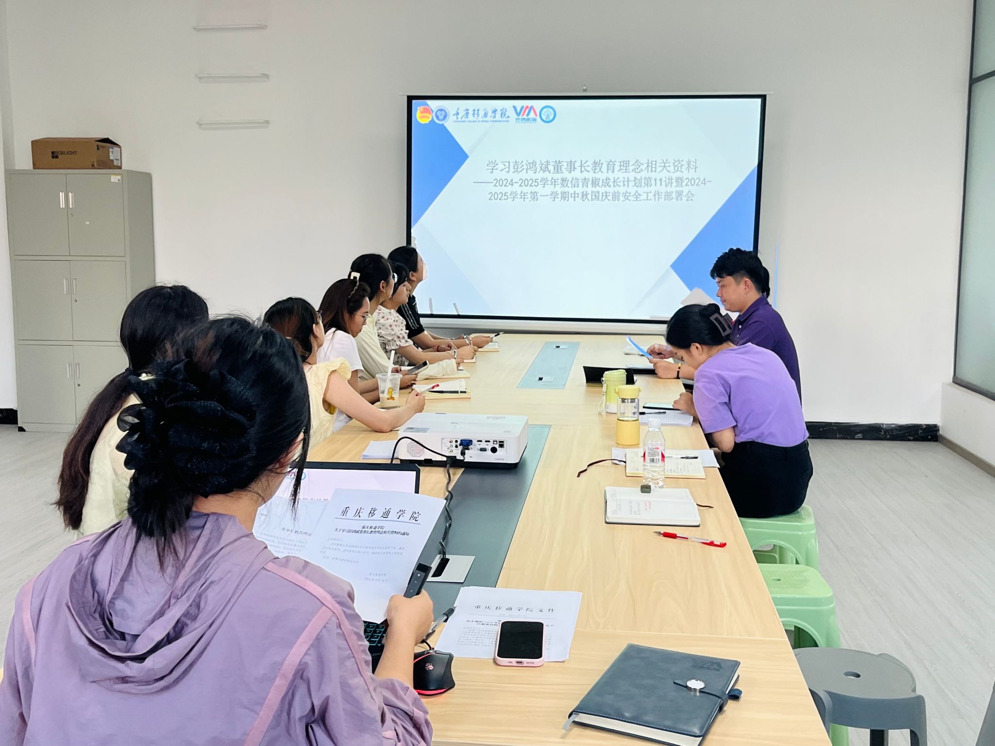 为深入贯彻落实学校关于学习彭鸿斌董事长讲话精神,提升学工队伍工作水平,数信学院于2024年9月17日16:00在仁者楼507召开了学习彭鸿斌董事长讲话专题学习会。会议旨在引导大家理解、掌握、贯彻彭鸿斌董事长提出的教育理念,将董事长的讲话融入日常、干在平常,以实际行动推动学院发展和个人成长。本次会议由学工副院长任瑞娟主持,綦江校区全体辅导员参加。