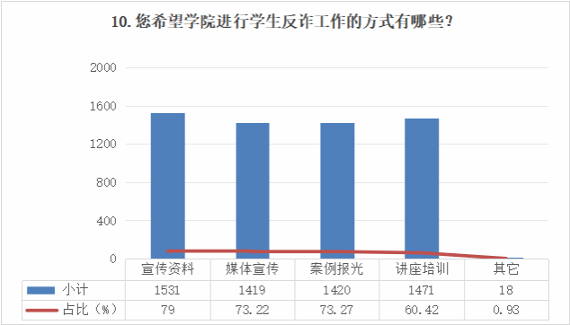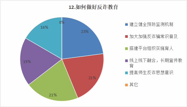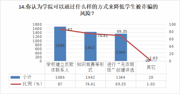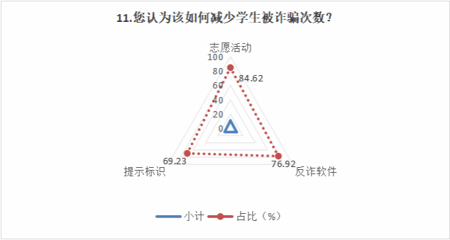 11.建立反欺诈宣传联系人制度、加强与相关部门的联系推动、“无诈班级”创建评选活动等都是被学生认可的较有效的防诈教育措施,同时,学院还应进一步探索更多有效的防诈教育方法,制定更全面的防诈教育工作体系。