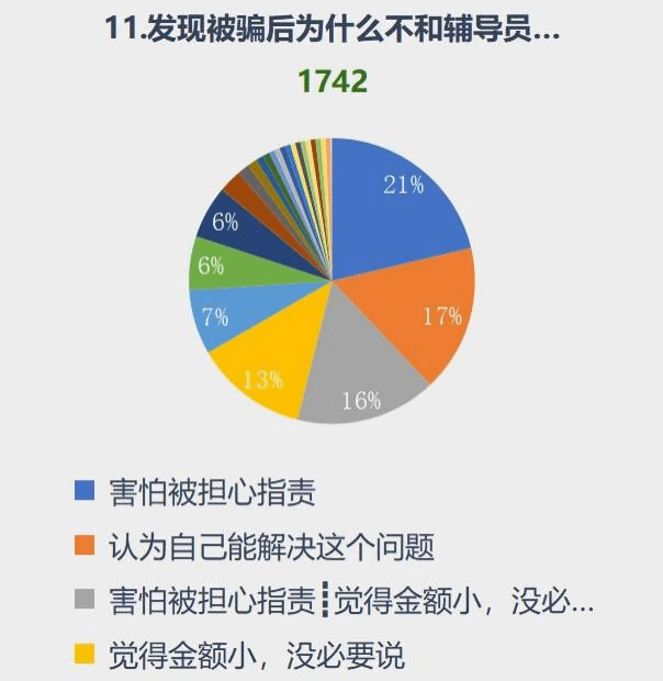 3. 为更好地了解同学们遭遇诈骗后的行为反应。问卷数据清晰地呈现出大学生被骗后不向辅导员和家人透露的原因具有多样性。总体来看,主要集中在大学生被诈骗后的心理负担大、被诈骗的金额较小、盲目独立等。
