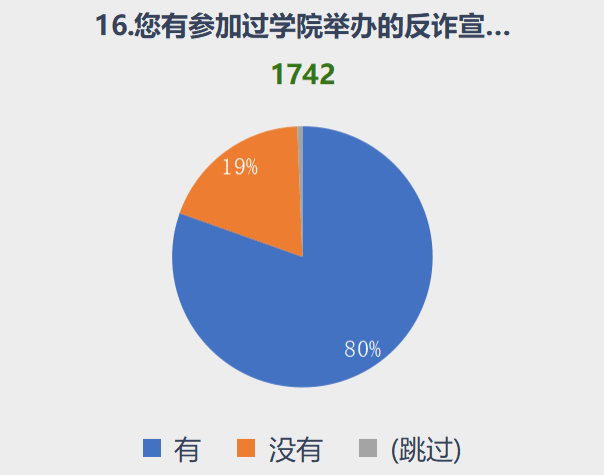 6.调研结果显示,82%的同学参加过学院举办的反诈宣传活动,这表明学院在反诈宣传方面已有一定的覆盖率和影响力,但是还存在少部分同学表示未参加,说明学院的反诈宣传还是存在一定的盲区。