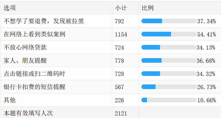 4. 从数据可见,大学生意识到被骗的时机丰富多样,网络诈骗的方式随机多变,其中在网络上看到类似案例以54%的高占比凸显出网络信息在反诈骗认知中的关键作用。不想学退费被拉黑、家人朋友提醒均占36%,表明他人提醒对被诈骗的识别具有重要作用。