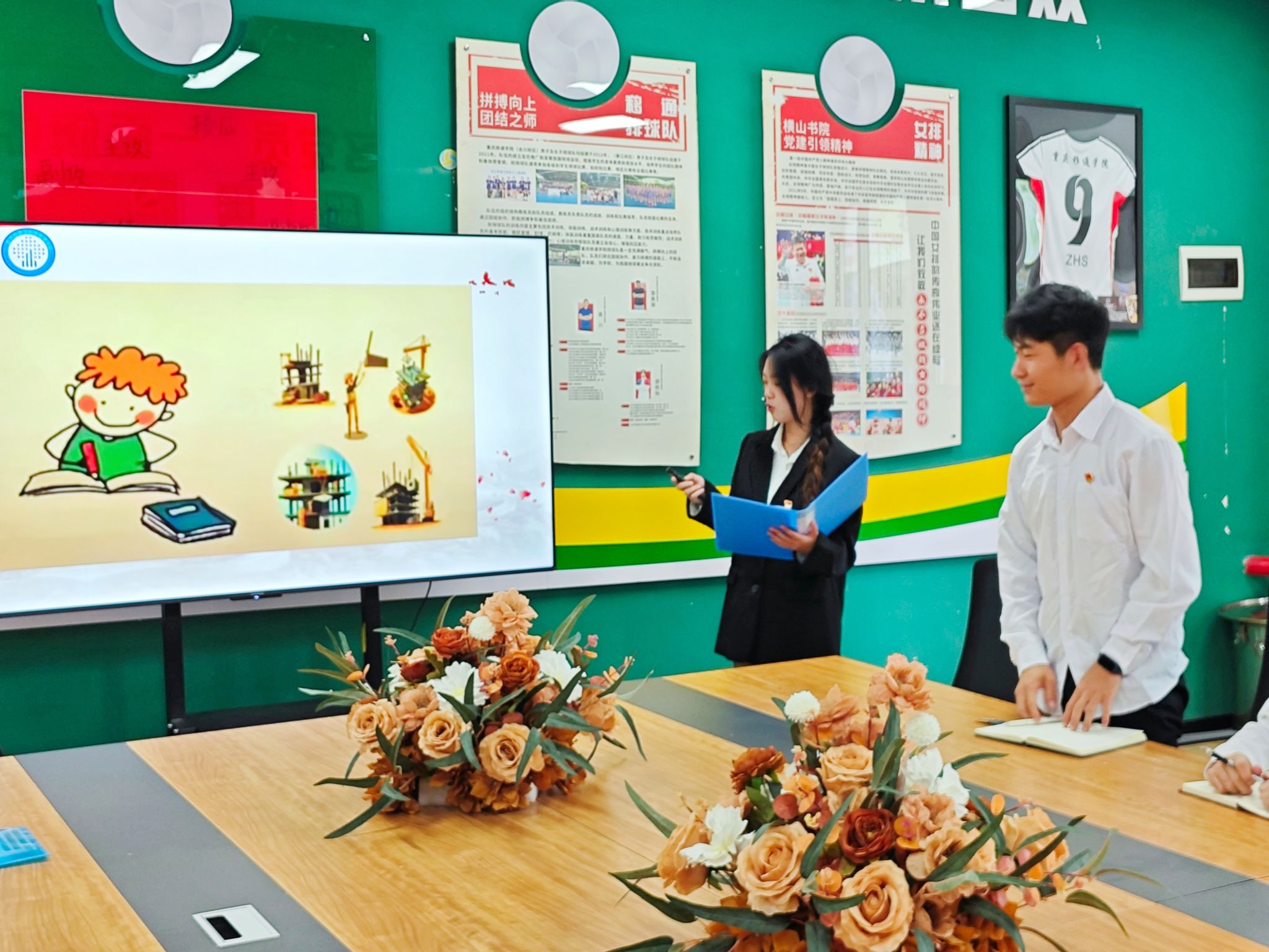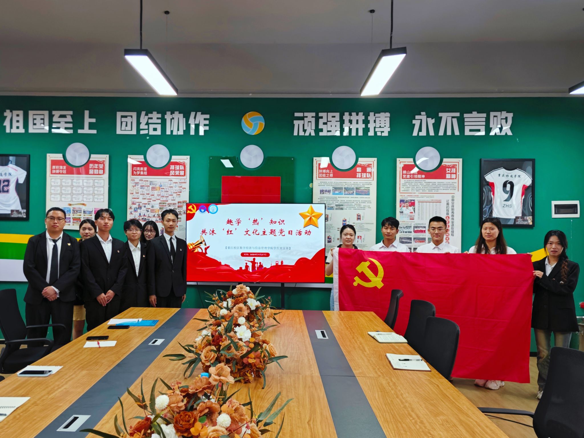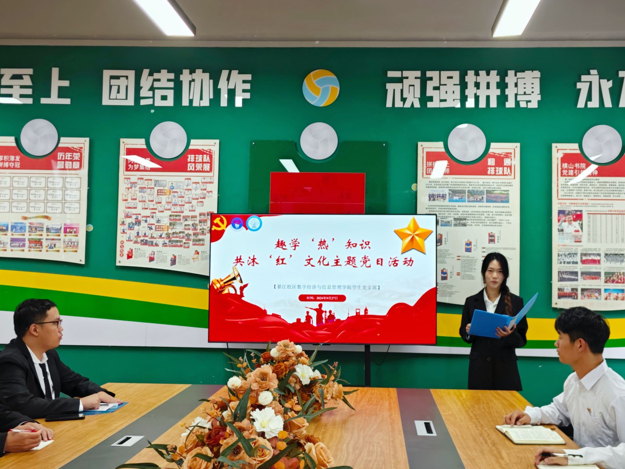 习近平总书记指出:“中国式现代化是物质文明和精神文明相协调的现代化,要弘扬中华优秀传统文化,用好红色文化,发展社会主义先进文化,丰富人民精神文化生活。”为深入学习红色文化,让红色文化在新征程上焕发时代光芒,綦江校区数字经济与信息管理学院学生党支部于2024年9月27日下午在横山书院党团活动室开展了“趣学‘热’知识,共沐‘红’文化”主题党日活动。本次共有教师党员和学生党员11人参会学习,会议由王雨馨同志主持。