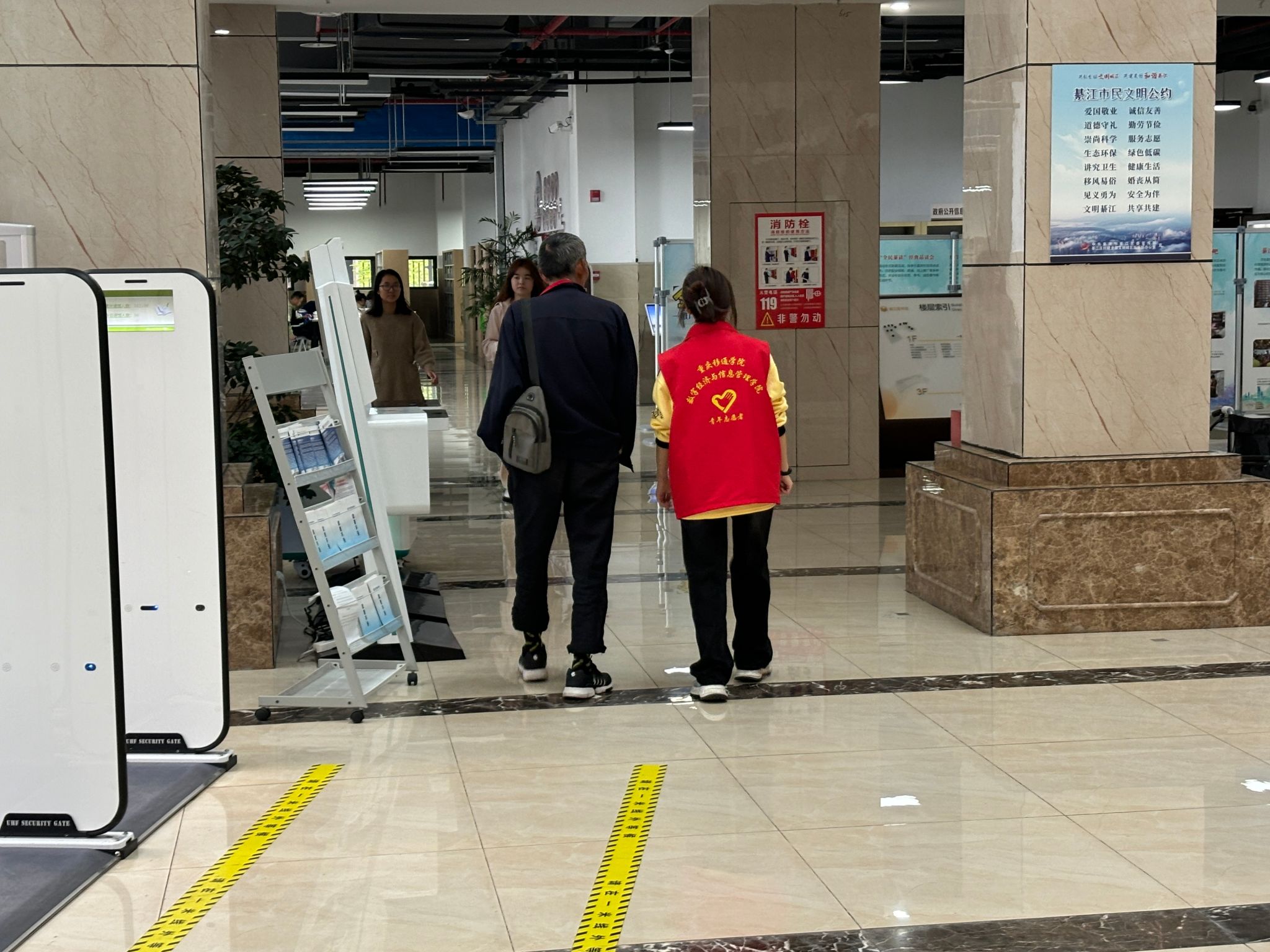 在图书馆开馆后,志愿者们迅速到达各自的岗位,开始了忙碌的引导工作。在借阅咨询台,志愿者们耐心地解答读者关于借阅规则的种种疑问,如借阅期限、续借方法以及如何办理借书证的流程等。面对一些老年读者对电子借阅系统不熟悉的情况,志愿者们更是手把手地教他们操作自助借阅设备,用温和的语气和细致的态度消除了老年读者对新技术的畏难情绪。