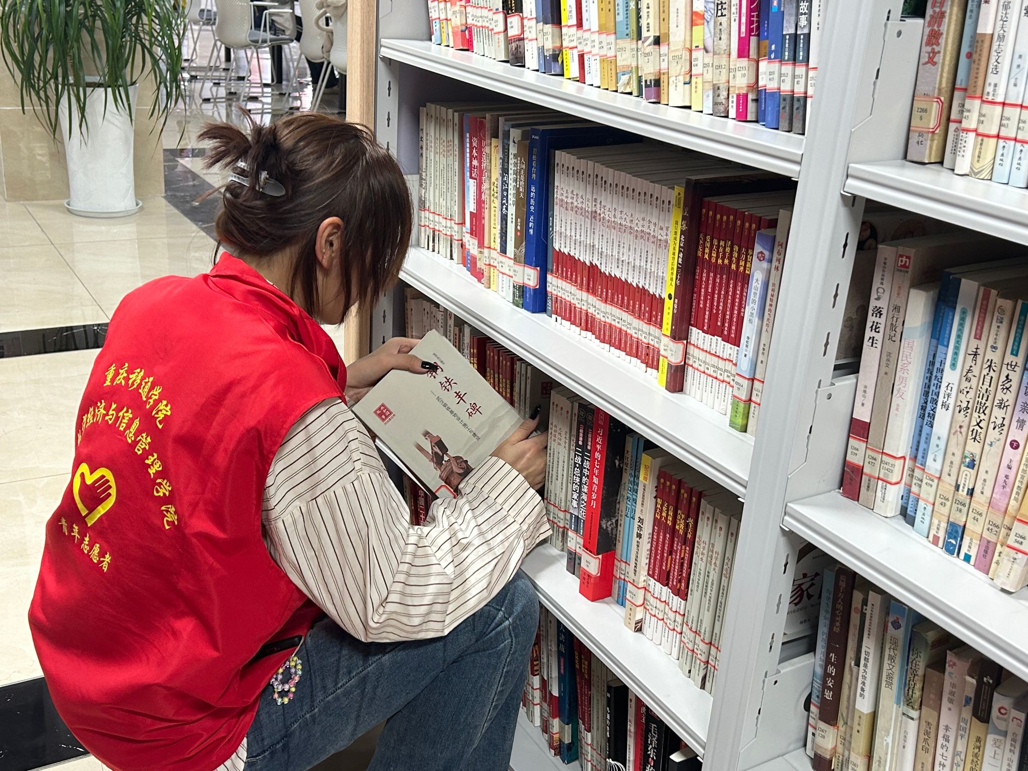 而在整理书架方面,志愿者们同样一丝不苟。他们小心翼翼地将归还的图书一本本分类整理,并按照编号准确地放回书架。尽管这项工作略显枯燥,但志愿者们深知书架整齐有序对于提升读者借阅体验的重要性。他们就像图书馆里的无名守护者,默默付出,确保每一本书都能安然无恙地待在正确的位置,等待着下一位读者的翻阅。