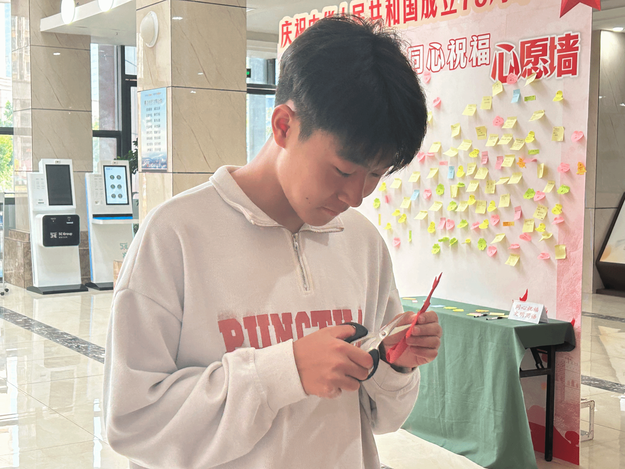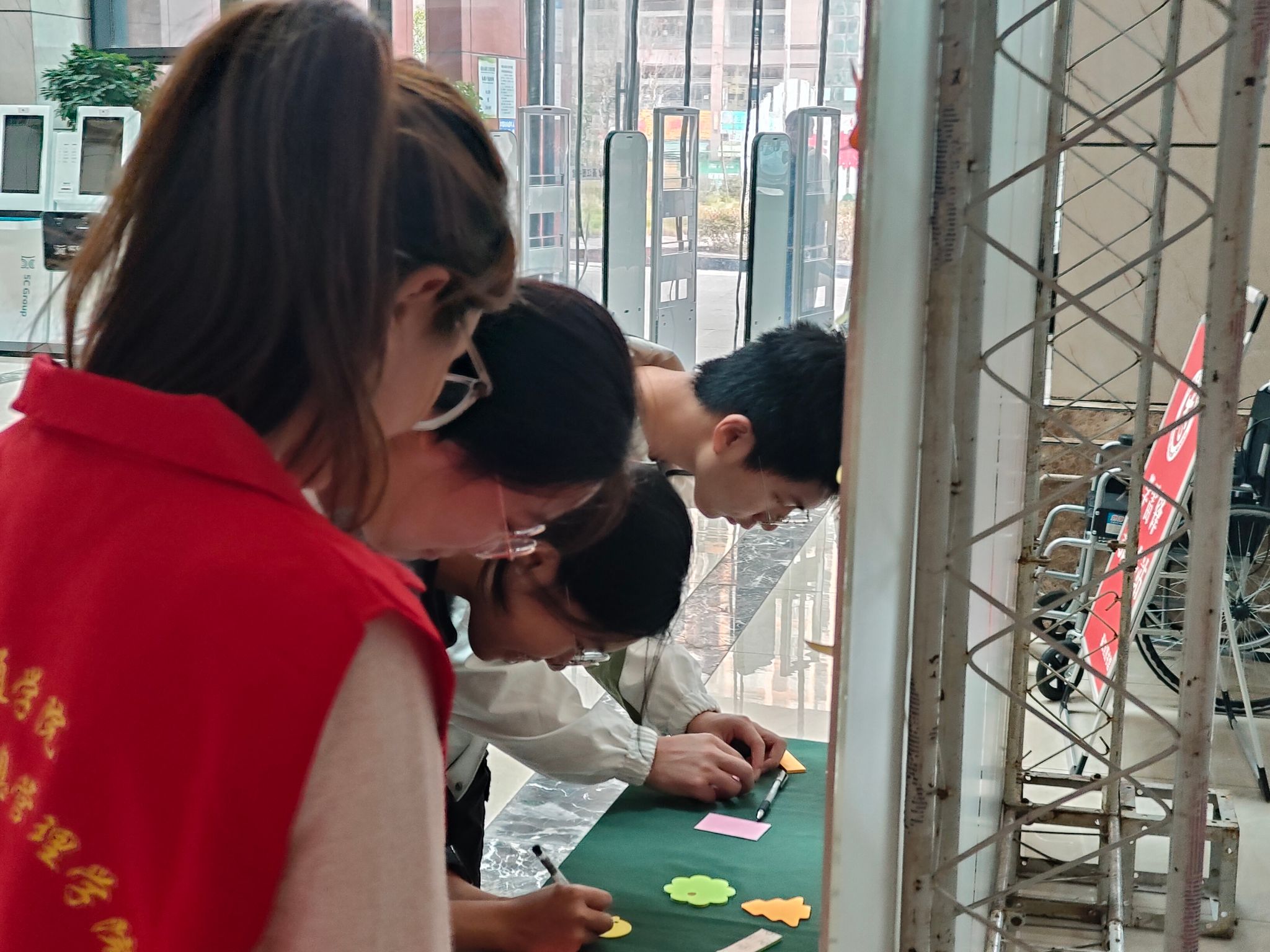 綦江图书馆为了保障本次活动顺利开展,设置了丰富的体验项目——VR 体验区、剪纸以及心愿墙,供参与者写下对祖国的美好祝愿。市民们对这些活动也有着浓厚的兴趣,在志愿者的指导下,共同开启了此次特别活动的体验之旅。