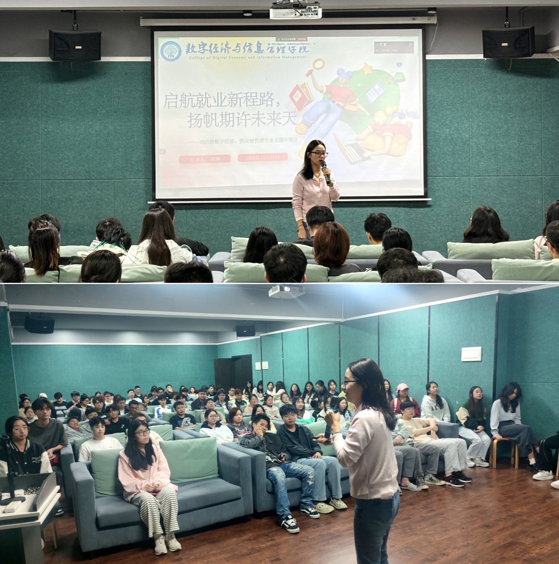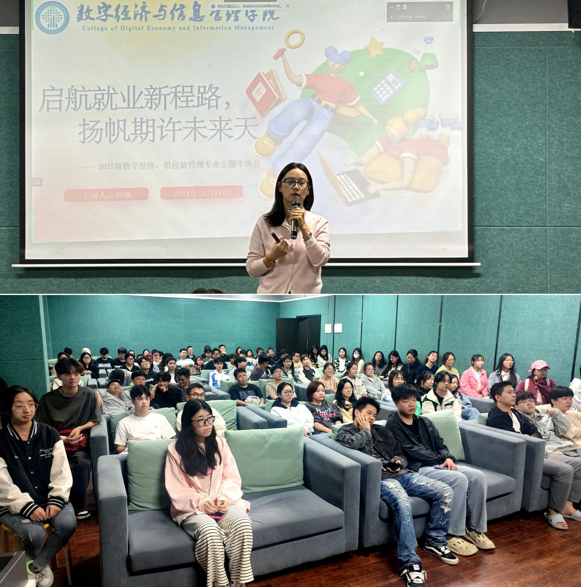 明确职业规划,助力未来梦想。为进一步加强同学们对当前大学生就业形势的认识,增强就业观念、提高自身竞争能力,2021级数字经济、供应链管理专业于2024年10月21日15:00在爱莲多功能影音室成功开展“启航就业新路程,扬帆期许未来天”主题年级会。本次会议由辅导员刘琳老师通过就业规划指导、学业路径引领及安全教育的三大板块内容进行讲解,为同学们解决毕业、就业方面的困惑之处,也为同学们积极就业打下坚实基础。