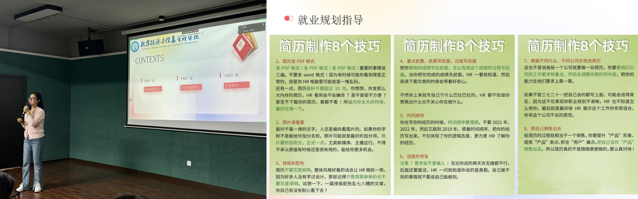 正值秋季招聘高峰期,辅导员刘琳老师激励大家广泛投递简历,积极筛选机会,无论结果如何,都应保持昂扬斗志,坚持不懈。在简历打造上,她传授了八条实用技巧,指出简历是大学生涯成果的缩影,需精心打磨以展现最佳自我。
