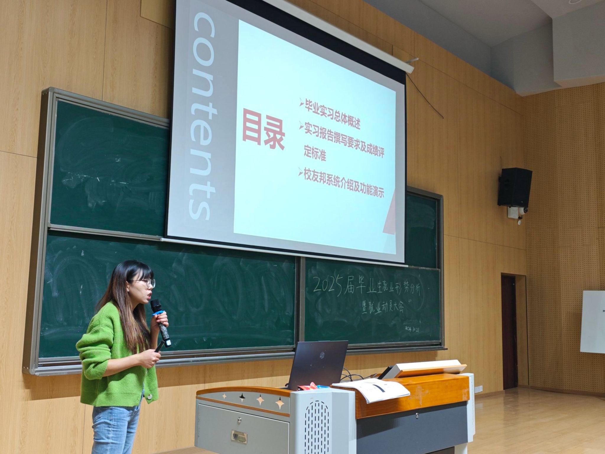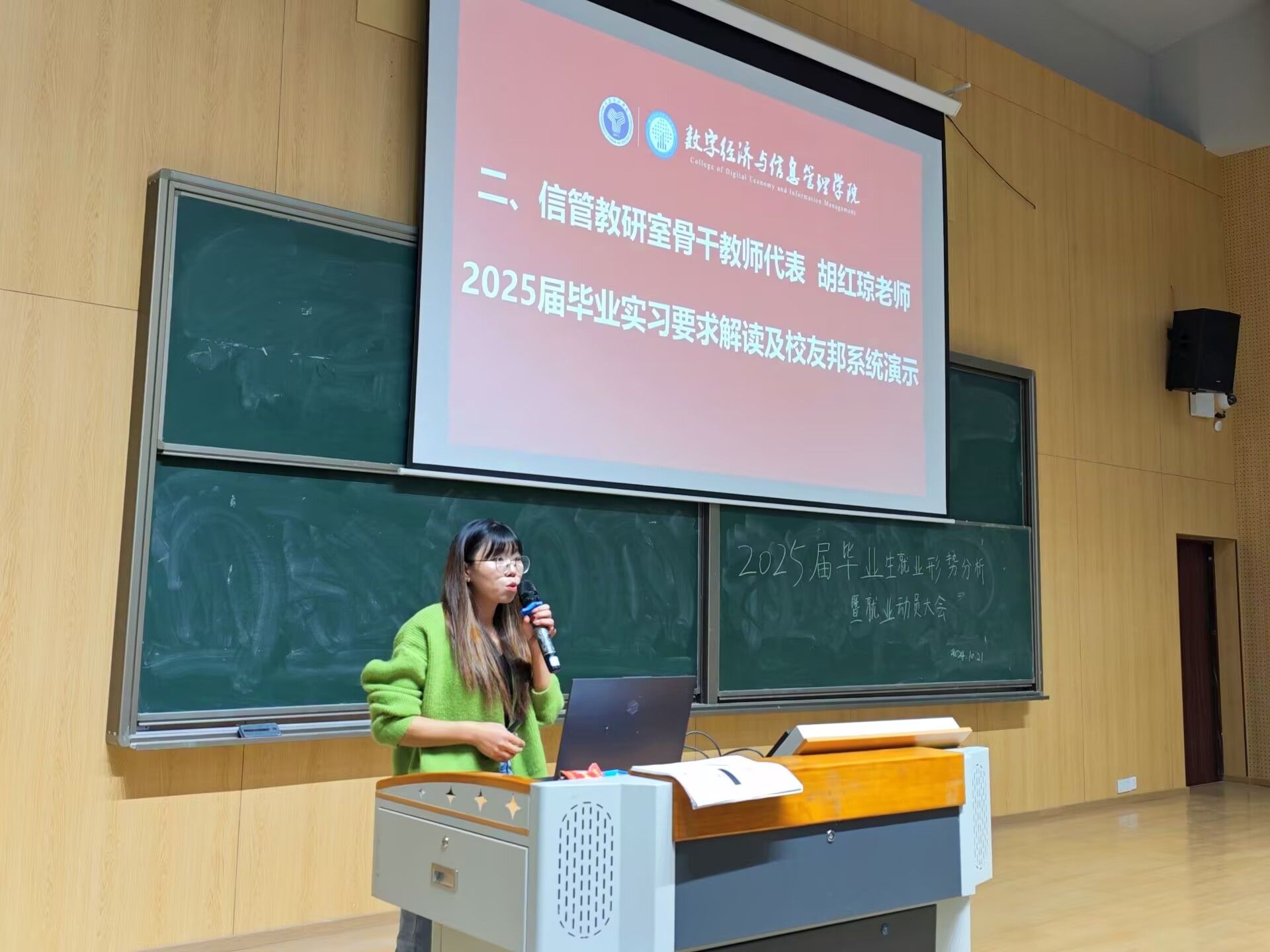 紧接着,信息管理教研室的骨干教师代表胡红琼老师,为同学们深入解读了毕业实习的具体要求,并现场演示了校友邦系统的使用方法。首先,胡老师着重指出,毕业实习作为必修课程,其要求严格,每位同学都必须严格遵守实习规定,圆满完成考核,方能获得相应的学分。她强调,毕业实习不允许重修或重考,必须一次性通过,否则将直接影响到同学们的毕业进程,以此提醒同学们务必高度重视。随后,胡老师详细阐述了实习报告的撰写规范以及成绩评定的具体标准,帮助同学们明确写作方向和评分标准。最后,胡老师亲自向同学们展示了“校友邦”系统的操作流程,并耐心讲解了使用过程中需要注意的事项及相关要求,确保每位同学都能熟练掌握并正确使用该系统。