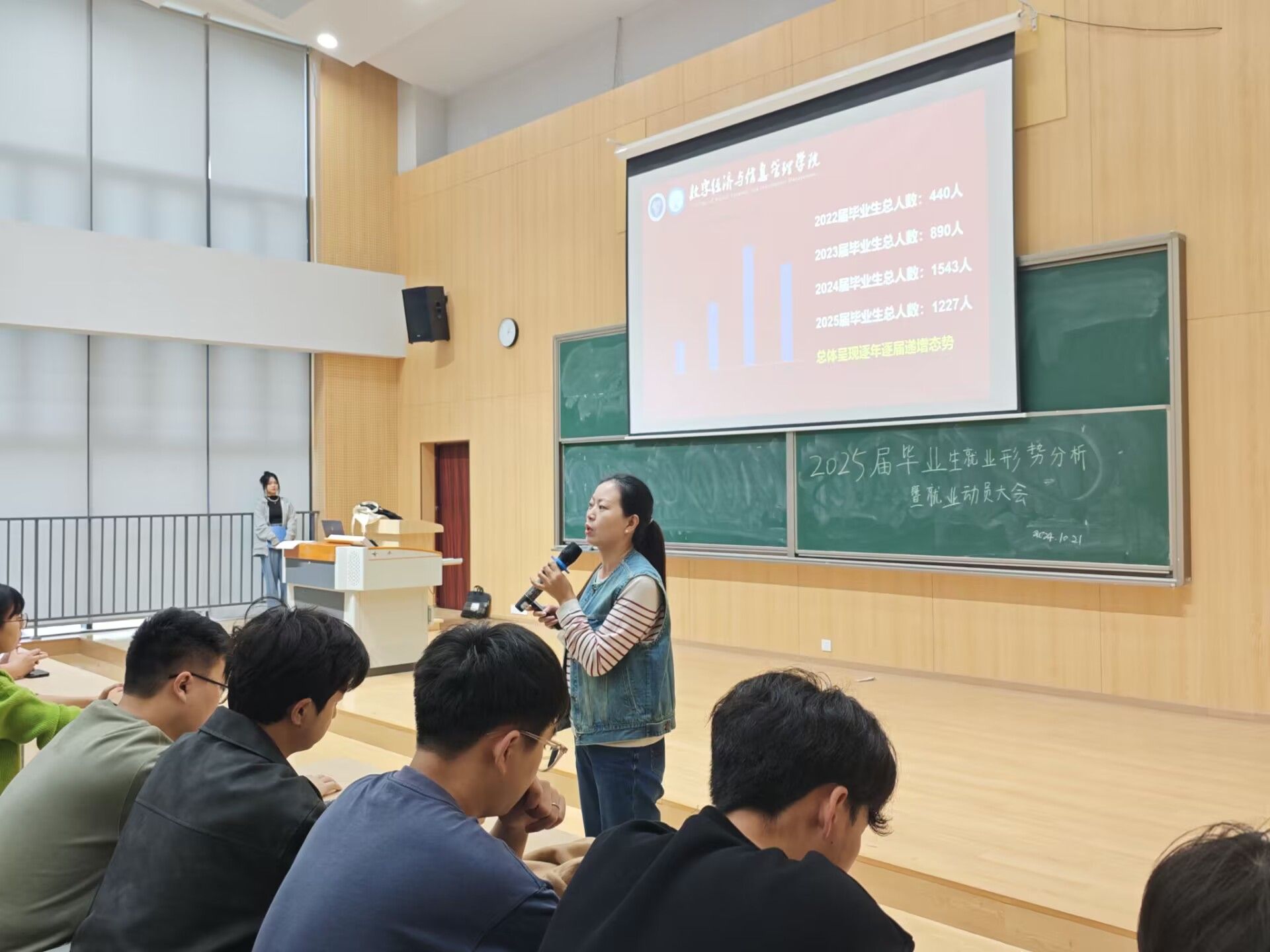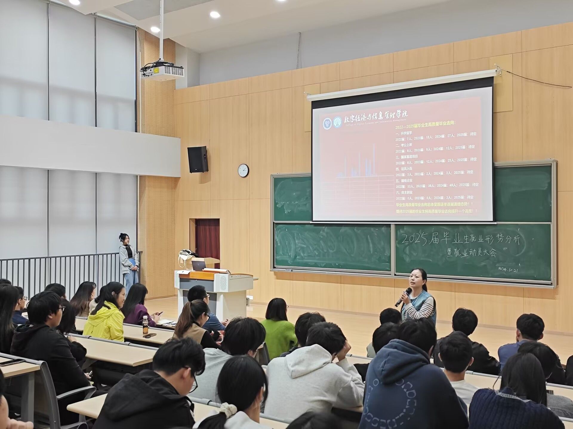 数字经济与信息管理学院于2024年10月21日15:00在玉棠书院阶梯教室成功召开了2025届毕业生就业形势分析暨就业动员大会。本次会议邀请到了数字经济与信息管理学院院长刘贵容教授、学工副院长任瑞娟副教授、信管教研室主任文豪老师、信管教研室教师代表,2025届毕业生及辅导员全体参与。此次大会旨在全面剖析当前就业形势,增强毕业生时间紧迫感和求职积极性,并激发他们更加主动地探索就业机会。