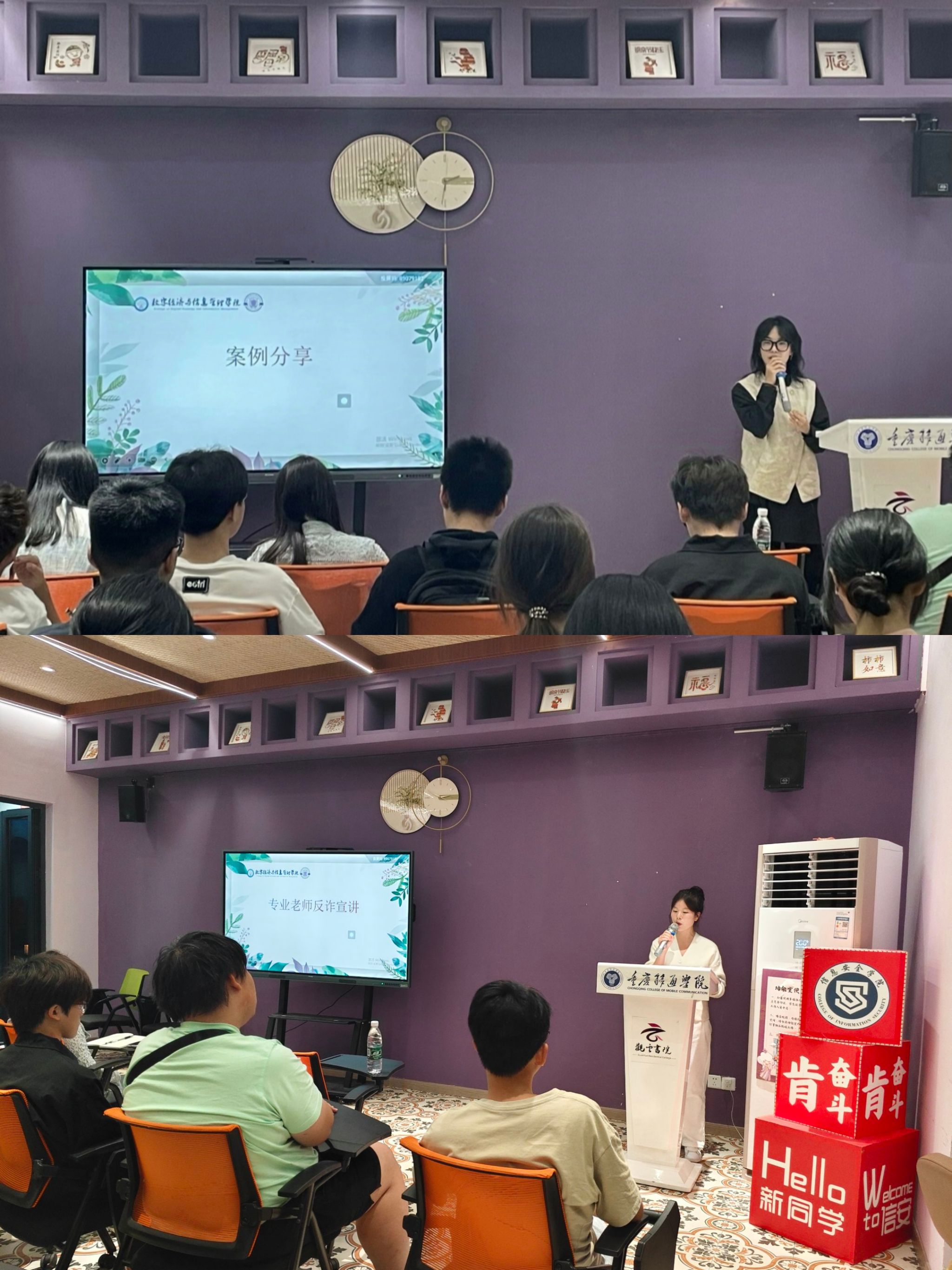 此外,活动还邀请了张雪老师来到活动现场为我们进行反诈宣传。老师深入浅出地讲解了当前诈骗犯罪的严峻形势,以及大学生容易上当受骗的客观现实,让新生们深刻认识到诈骗行为的多样性和危害性。同时,老师还介绍了遭遇诈骗后的应对方法,如第一时间报告辅导员、保存证据等,提醒同学们在遇到诈骗时要冷静应对,最大限度地减少损失。