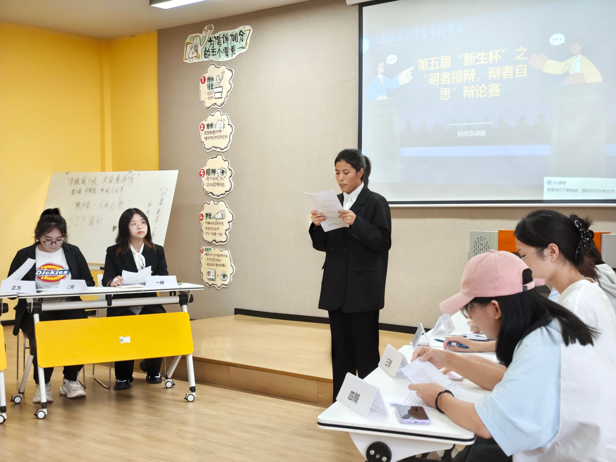 为提高数字经济与信息管理学院学生的思辨力,提升学生们参与校园活动的积极性,第五届“新生杯”之“明者擅辩,辩者自思”主题辩论赛初赛于10月17日16:00在玉棠书院扎堆朋辈空间及瀛溪书院语者演讲培训室顺利举行。此次初赛邀请到了数字经济与信息管理学院李巧莹老师、罗德康老师、彭仙老师、张雪老师、王凤老师作为本次比赛的评委。