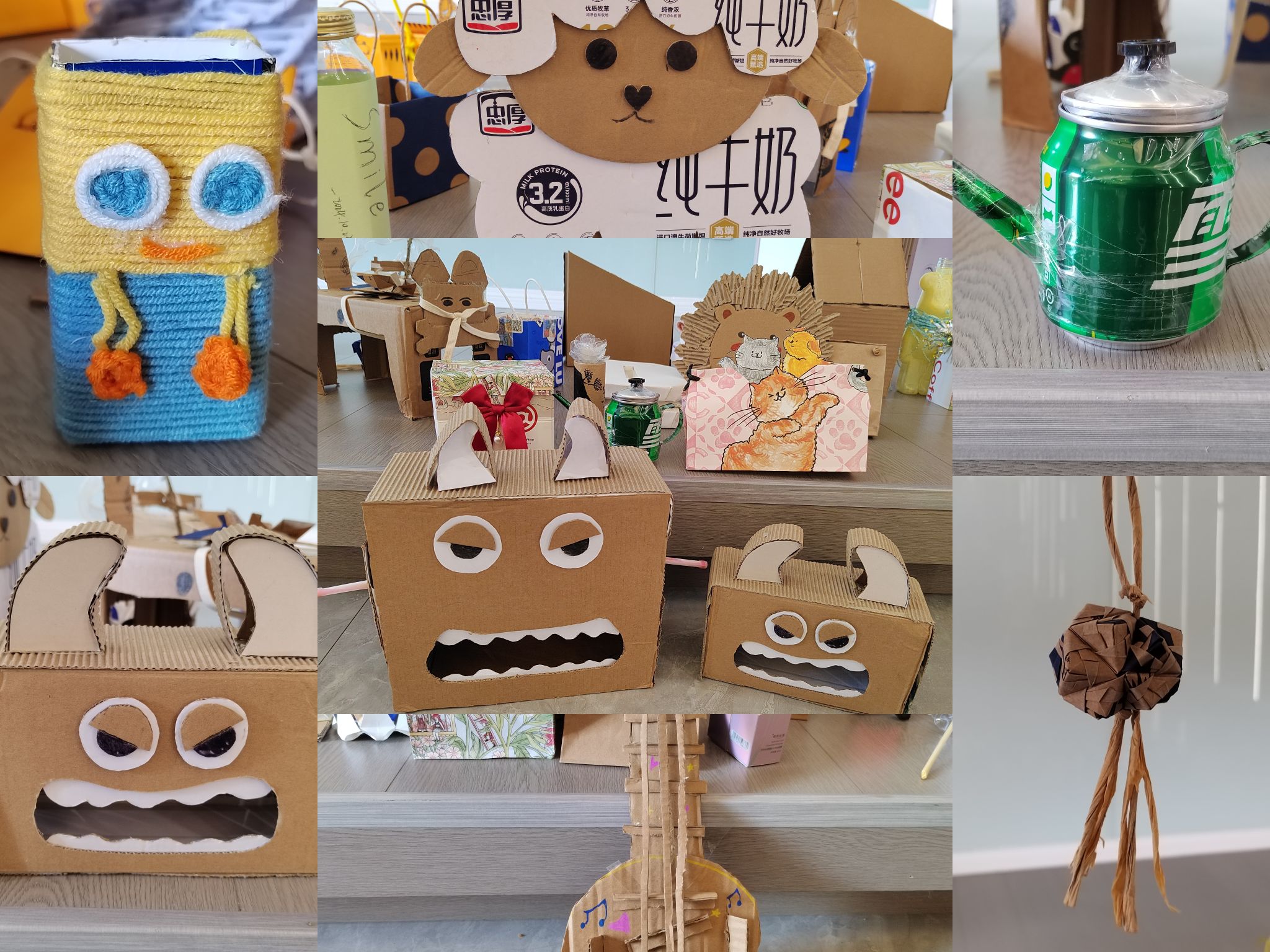 本次“创意无限,废品改造”活动要求参赛者自主利用废品进行改造,并将作品提交至观云书院秋分多功能活动室。活动围绕废物利用展开,我们收到了众多充满同学们奇思妙想的改造作品,有用旧纸盒制作的小动物和吉他,用奶茶打包纸袋叠成的花球和制作的收纳盒,还有用易拉罐制作的可爱小水壶以及漂亮的风铃等300余份作品。这些作品让已经废弃的物品重新焕发出新的魅力,使它们摆脱了被丢弃的命运。
