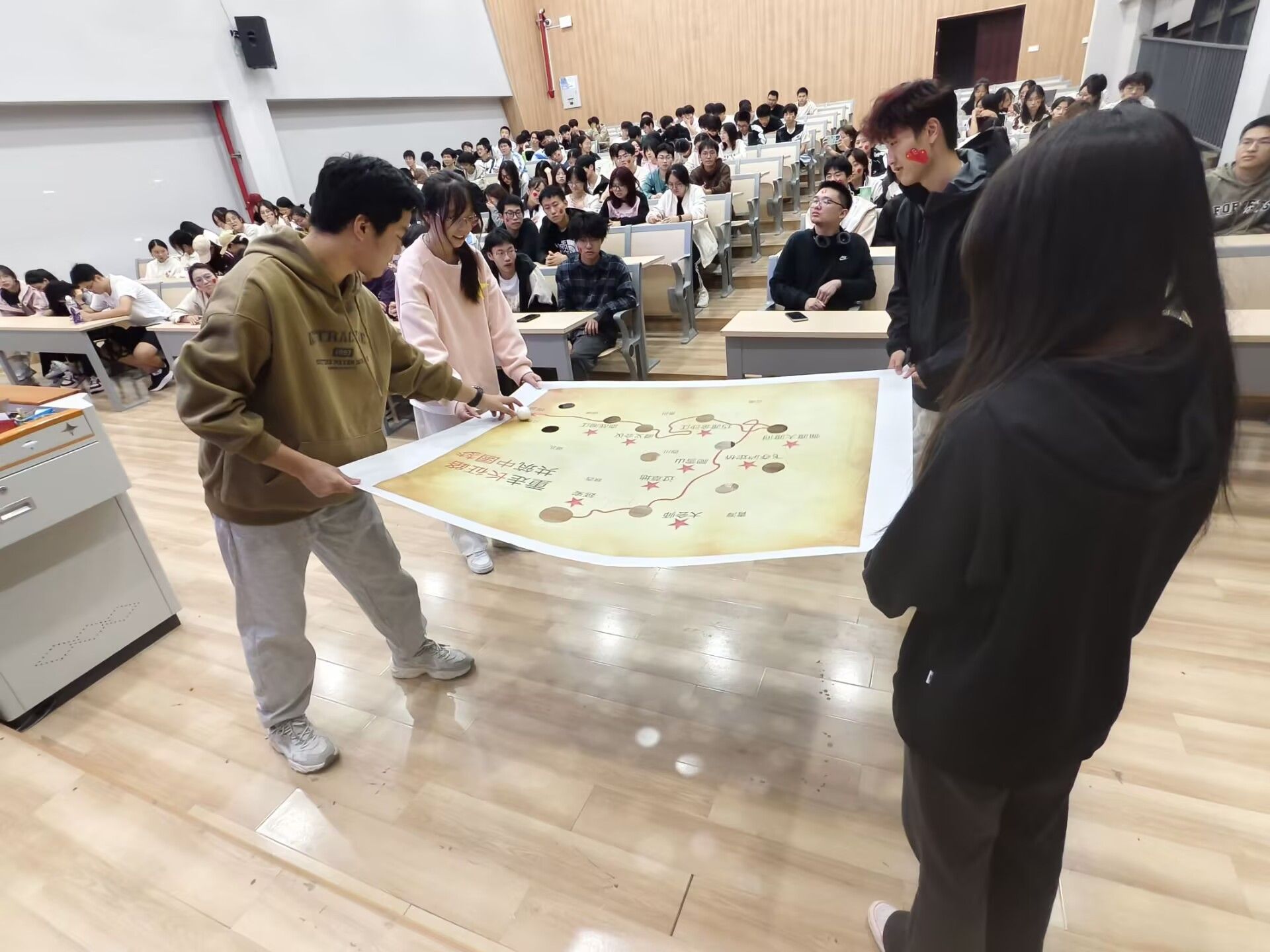 寓教于乐,本次活动还开展了配音、重走长征路等趣味小游戏。站在这片红色的土地上,模仿着先烈说过的话、发过的誓,声声呐喊,震撼人心。两万五千里长征路,路途漫漫,艰险诸多,地图上前进的是歪歪扭扭的小球,但在那广袤的大地上,是义勇奋进的革命军。彭仙老师与同学们一起参与到活动中来,团结协作,在活动中深刻体会先烈们无畏险阻、顽强拼搏的革命精神。在最后的总结发言中,彭仙老师表示,希望通过此次活动同学们能够牢记历史,缅怀先烈,树立远大的理想,磨练顽强的意志,练就过硬的本领,为祖国的繁荣富强贡献自己的力量。