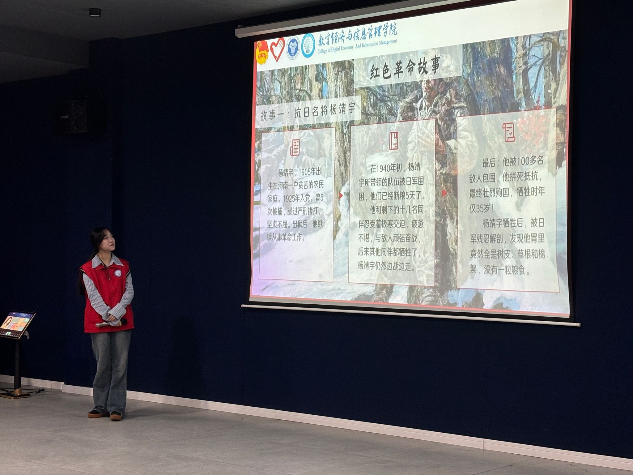 接着,主讲人通过几个经典且感人至深的革命故事,让我们了解了革命的艰辛与刻苦。通过抗日名将杨靖宇的英勇事迹、狼牙山五壮士的悲壮壮举、董存瑞舍身炸碉堡的英勇无畏、刘胡兰视死如归的坚定信念以及邱少云在烈火中的壮烈牺牲等红色历史的讲述,同学们的心情变得凝重,深切感受到了革命烈士不惧牺牲、勇于奉献的高尚品质。