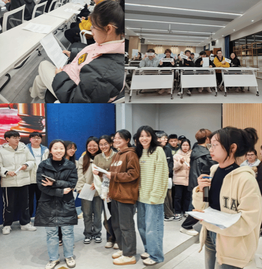 活动开始,同学们排队来到了年级会现场,在工作人员的邀请下,有序入座。随后主持人陈莹以法为题开宗明义,并简要介绍了本次年级会的主题与流程;四个剧本各有主题,看似无关却线索相连。同学们自发分成4个小组,在DM的带领前往每个剧本分会场,寻找法律线索。