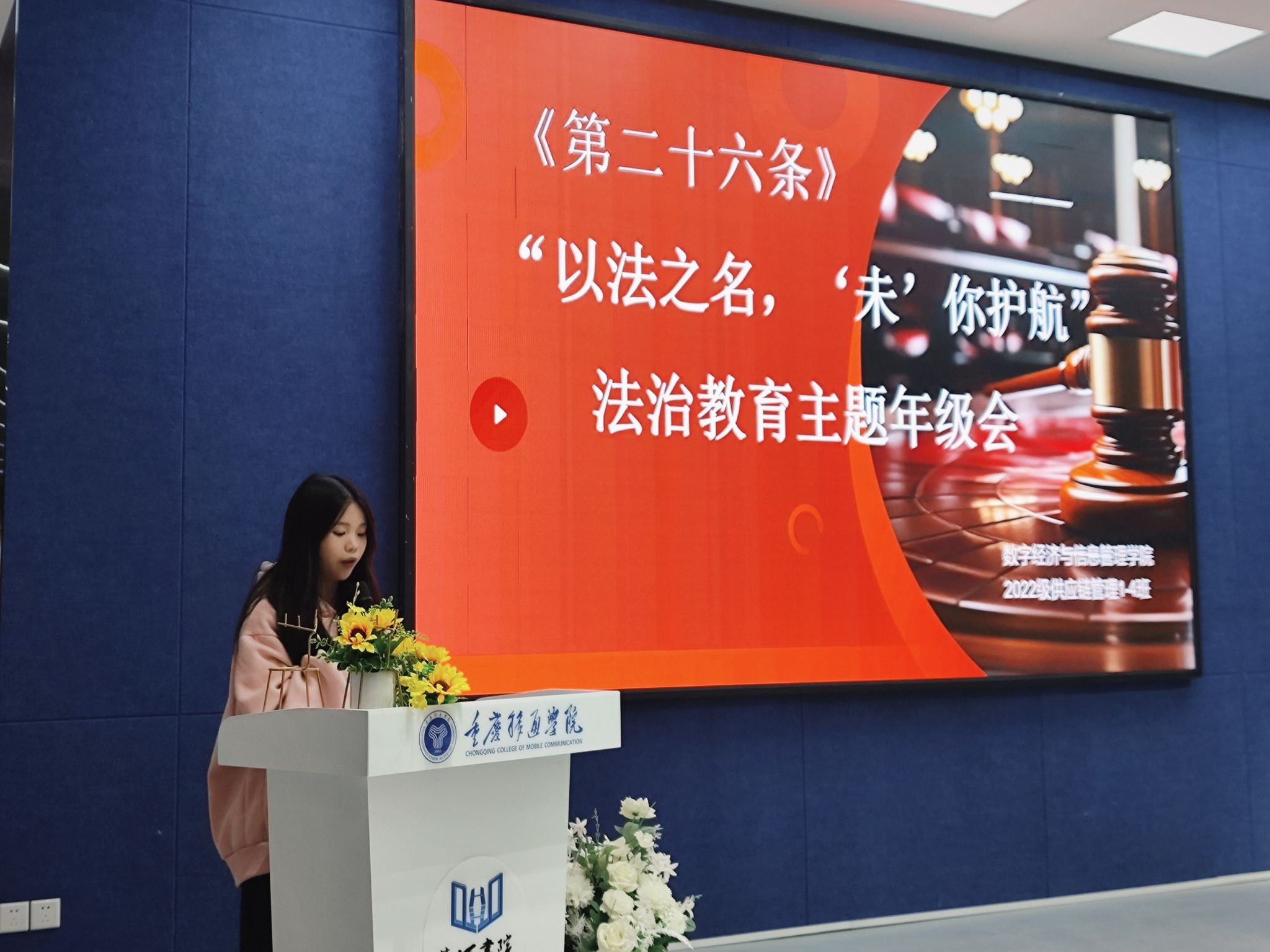 为增强大学生法律意识,提升法律素养,提高大学生运用法律维护自身合法权益的能力,数字经济与信息管理学院2022级供应链管理1-4班于3月19日19时在綦河书院召开《第二十六条》——“以法之名,‘未’你护航”主题年级会。本次年级会以邯郸初中生事件为切入点,以《刑法第二十六条》为基点,围绕擦边直播、网络恋爱、交通安全、防窥隐私相关问题展开,将法律融入原创剧本中,通过用大学生喜欢的剧本杀形式,寄语同学们学法以正,普法以诚,明法以精,尚法以恒。
