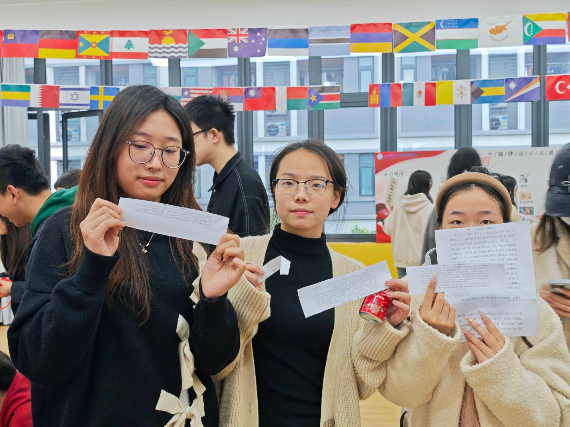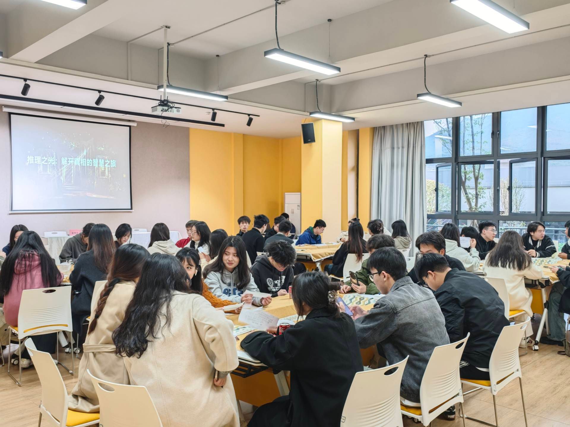 活动伊始,主持人向大家介绍了活动的主题和规则,大家分好组后根据剧本线索及通过与其他角色的交流来推演剧情,随后来到了二楼的很正式研讨室来进行游戏获取线索。分别有“律法千条,必有一诗”“我是小法官,审判我在行”和“环环相扣,套圈挑战”三个小游戏。现场秩序井然,同学们踊跃参与尝试,凭借一些法律基础知识,不仅获得了线索,还有特色美食奖励,现场热闹非凡。