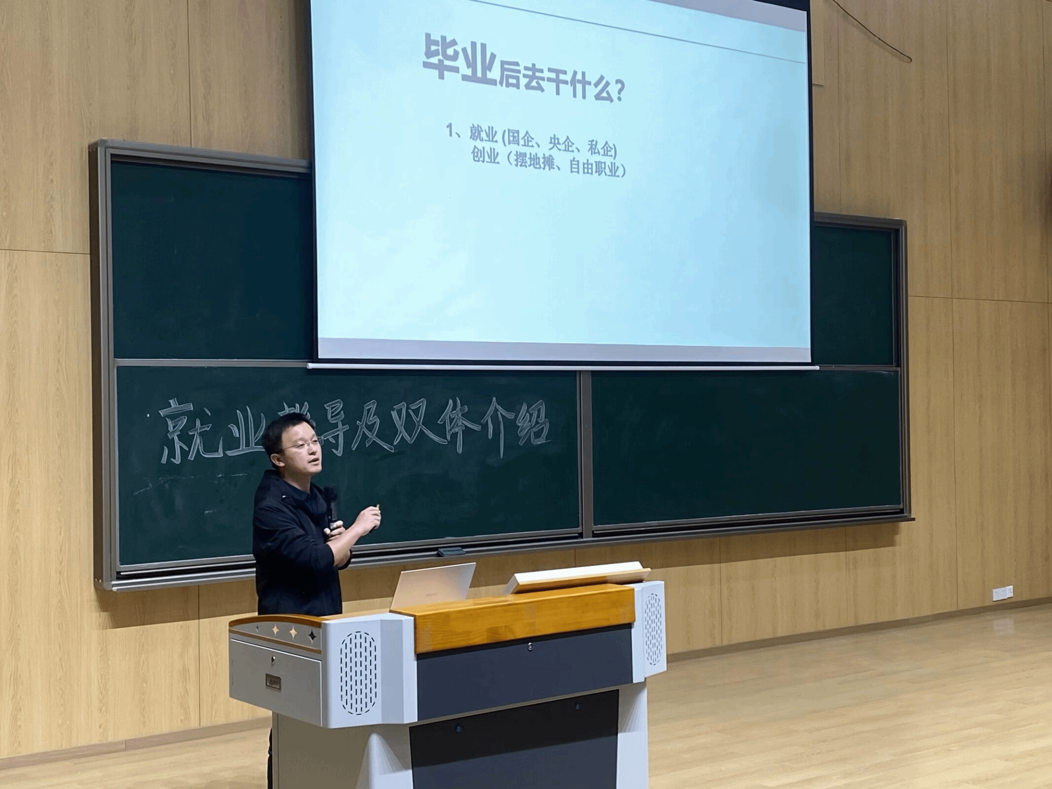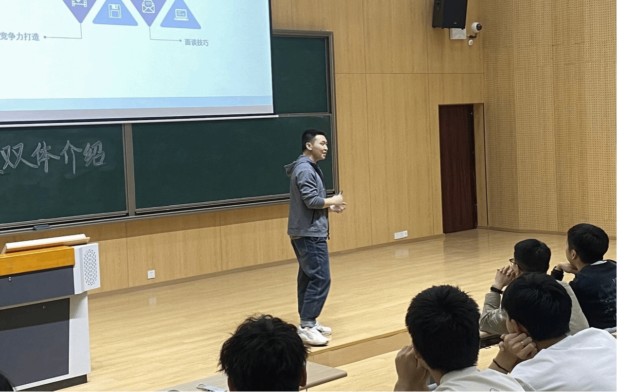 紧接着,胡权老师以其亲身经历为例,为同学们带来了一场关于降低就业压力的深度分享,他提到,作为移通双体受益人,双体的小班化教学和实战型演练为他指明了方向,一对一的沟通指导更让他受益匪浅,他在双体明确了目标,找到了奋斗的赛道,在双体的育人模式下收获、成长、蜕变,最后反哺双体。