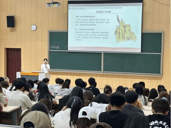 其次辅导员张静老师向同学们介绍“当兵的十大好处”俗话说:“当兵后悔两年,不当兵后悔一辈子。”参军入伍能练出一副素质过硬的强健体魄、拥有一批感情深厚的亲密战友、闯出一段丰厚宝贵的人生经历、取得一份社会认可的工作履历、获得一次弥足珍贵的学习机会……辅导员张静老师鼓励同学们结合自身从军报国的责任和就业需求积极报名参军,以青春热血助力改革强军伟业,通过拼搏奋斗奠定人生成长基石。同时,辅导员张静老师为同学们讲解了国防教育的意义,引导同学们树立爱国主义精神和国防观念,增强国家安全意识,大学生作为社会未来的中坚群体、人民军队的后备力量,其军事知识丰富程度与军事技能水平关乎国家安全和国防建设,通过讲解激发了同学们对进行军事知识学习和军事技能训练的积极性,营造了浓厚的校园国防氛围。