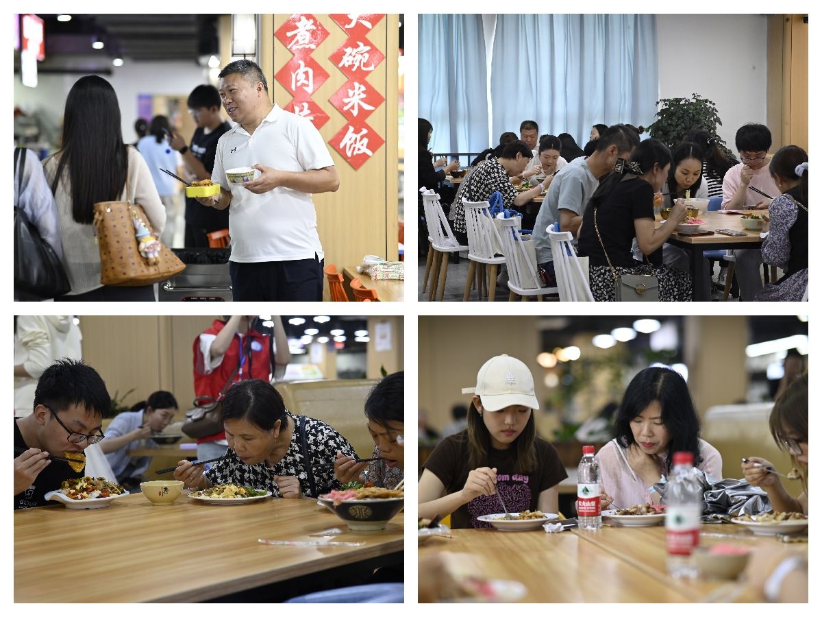 品尝一次食堂用餐。在食堂里面,家长们看环境、谈菜品,感受吃美味、吃健康、吃均衡的理念。我院潘显兵院长、刘贵容副院长、任瑞娟副院长携手教师代表和辅导员老师们与家长坐在一桌亲切交谈,品味校园的青春味道。各家长也纷纷表示对学校食堂规范严格的运作和管理非常满意,对同学们在校营养安全的饮食生活十分放心。