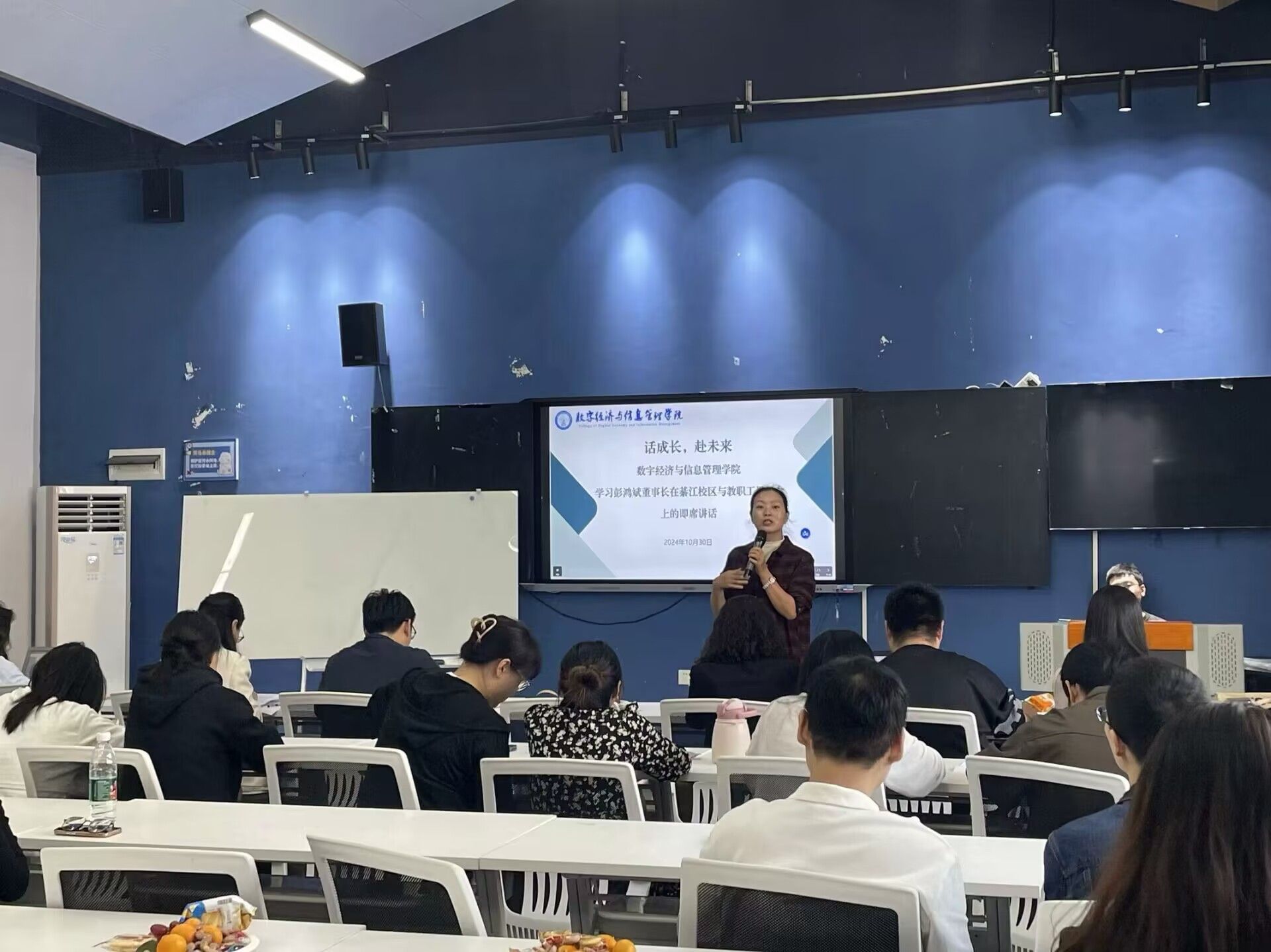 为进一步深入学习彭鸿斌董事长的教育理念和重要讲话精神,深刻领会集团战略思想,共同探讨如何将董事长的教育理念融入到日常教学中。数字经济与信息管理学院于2024年10月30日下午14点在綦江校区开展彭鸿斌董事长讲话集中学习专题会议。数字经济信息管理学院院长刘贵容教授主持会议,全体教职工参加。