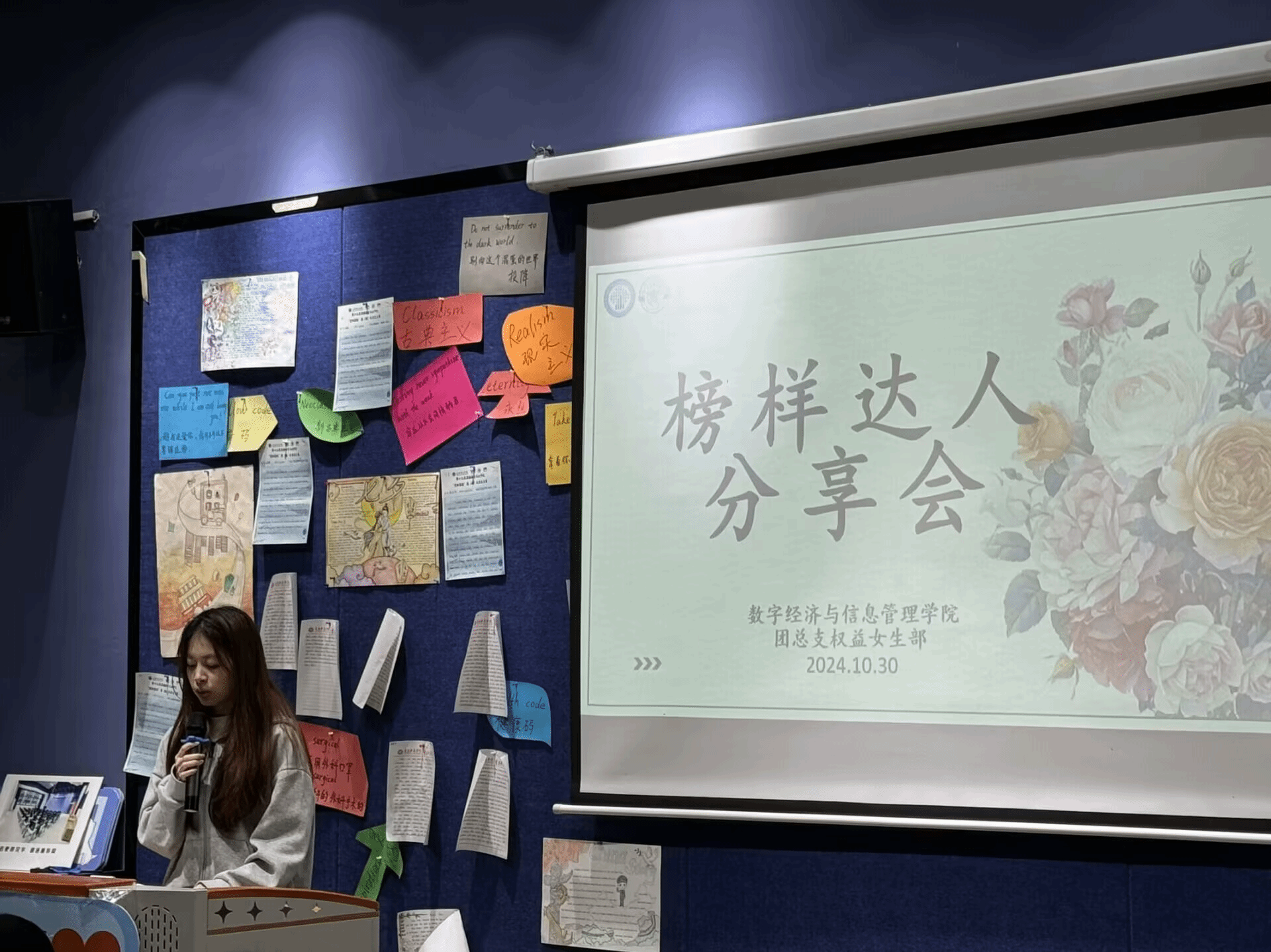 在金秋十月的温馨怀抱里,当微风轻拂过校园的每一个角落,带着淡淡的桂花香,也带来了知识与梦想的芬芳。为激发同学们的学术热情和创新潜能,拓宽知识储备,提升自身学术竞争力,端正做人做事的生活态度,弘扬乐教乐学、争创完满的崇高精神,学习先进榜样,促进大家共同成长。2024年10月30日18时,一场别开生面的榜样达人分享会在数字经济与信息管理学院权益女生部的组织下于綦河书院两句演讲培训室成功举办。出席本次活动的嘉宾有我院校社团板块张雪老师与李巧莹老师。众多参与者齐聚一堂,共同聆听榜样达人的精彩故事,汲取前行的力量。