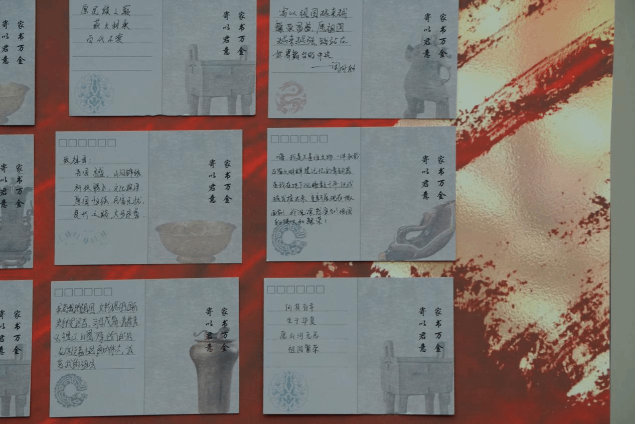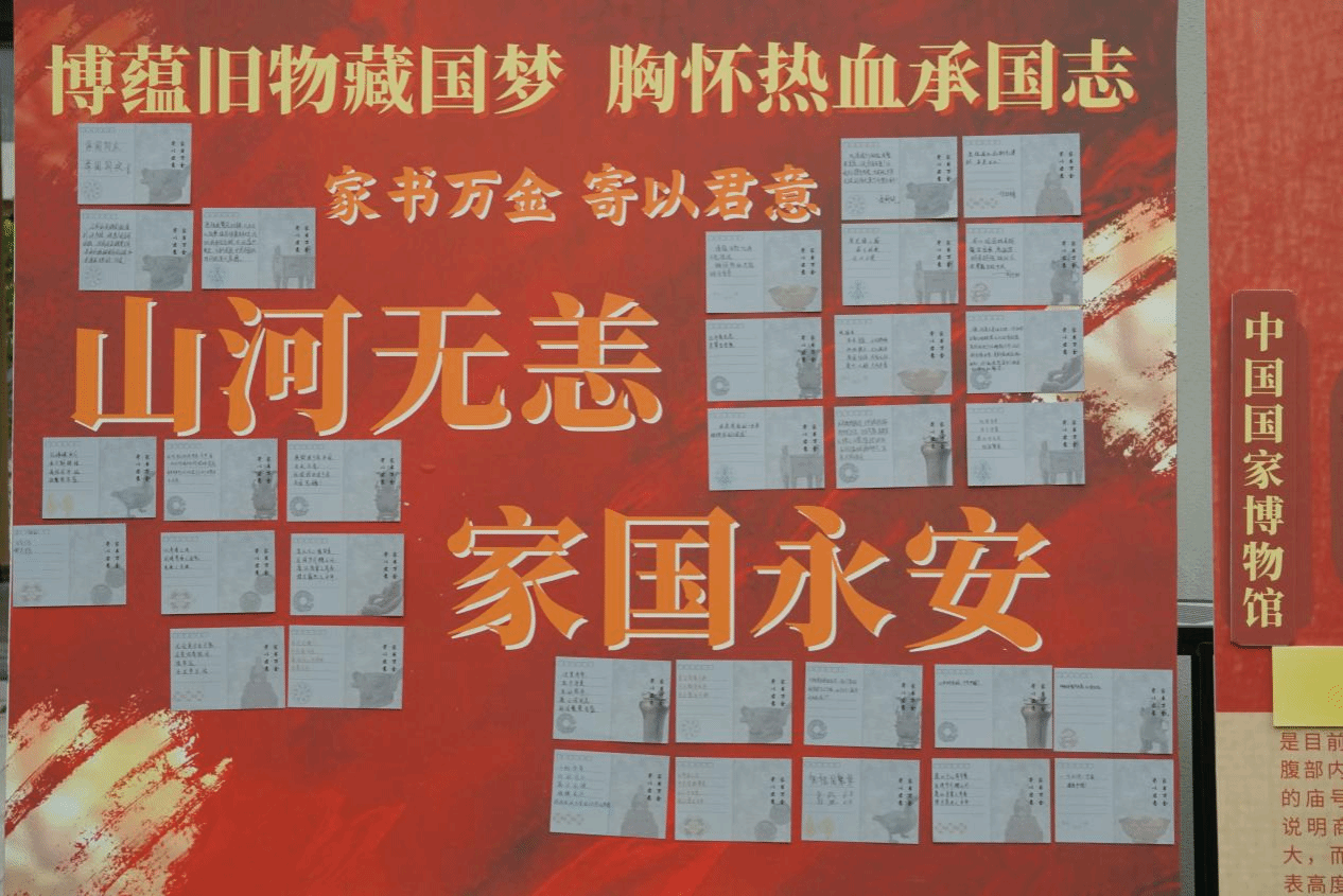 “君自故乡来,应知故乡事。来日绮窗前,寒梅著花未?”如果文物会说话,那么国外许多博物馆里“我要回家”的声音一定响彻云霄。在对文物信息不断了解并进行正确粘贴之后,对于文物的流失之殇,同学们感同身受,早已是千言万语,却道不尽心中思绪。文字的力量无声而又震耳欲聋。在家书纸上,同学们挥笔写下自己心中的期许,祝福祖国更加强大,也期盼着我国流失在外的文物能够早日回归祖国的怀抱。同学们也将自身带入流失文物的角度,落笔写下对亲人的思念,对回家的期盼,在字里行间中不断流露对家国今日状况的关心和祝福,愿山河无恙,家国永安。