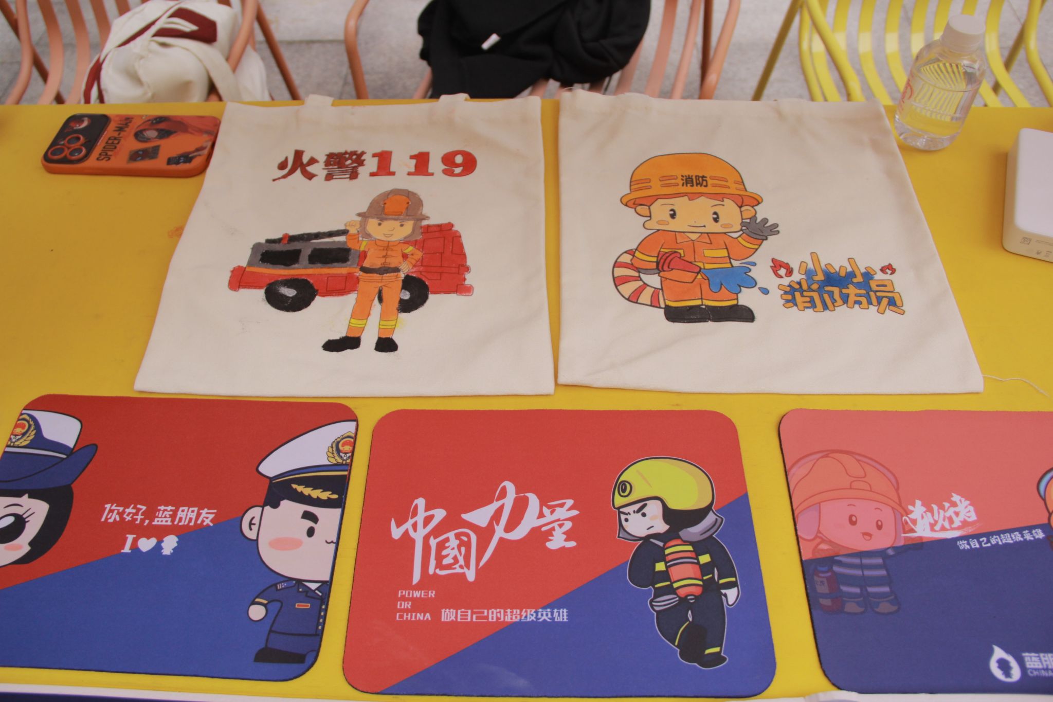 文创作品展示区展示了学生们以消防为主题的创意作品,如消防车模型、消防主题帆布包等,吸引了众多师生的目光,很多入场同学都驻足观看,细细欣赏着各种文创作品,并连连点头,向自己欣赏的作品竖起大拇指。